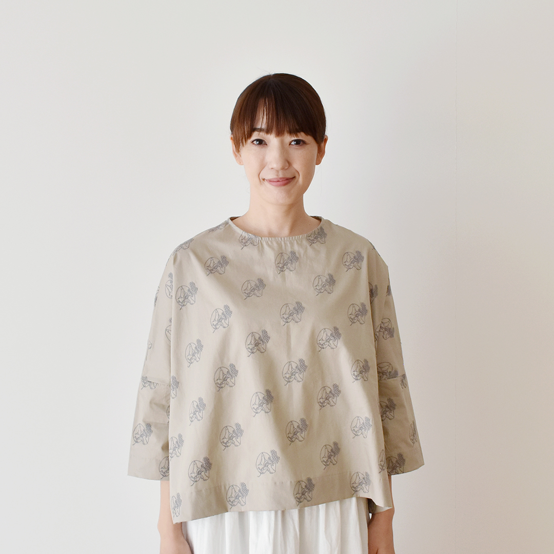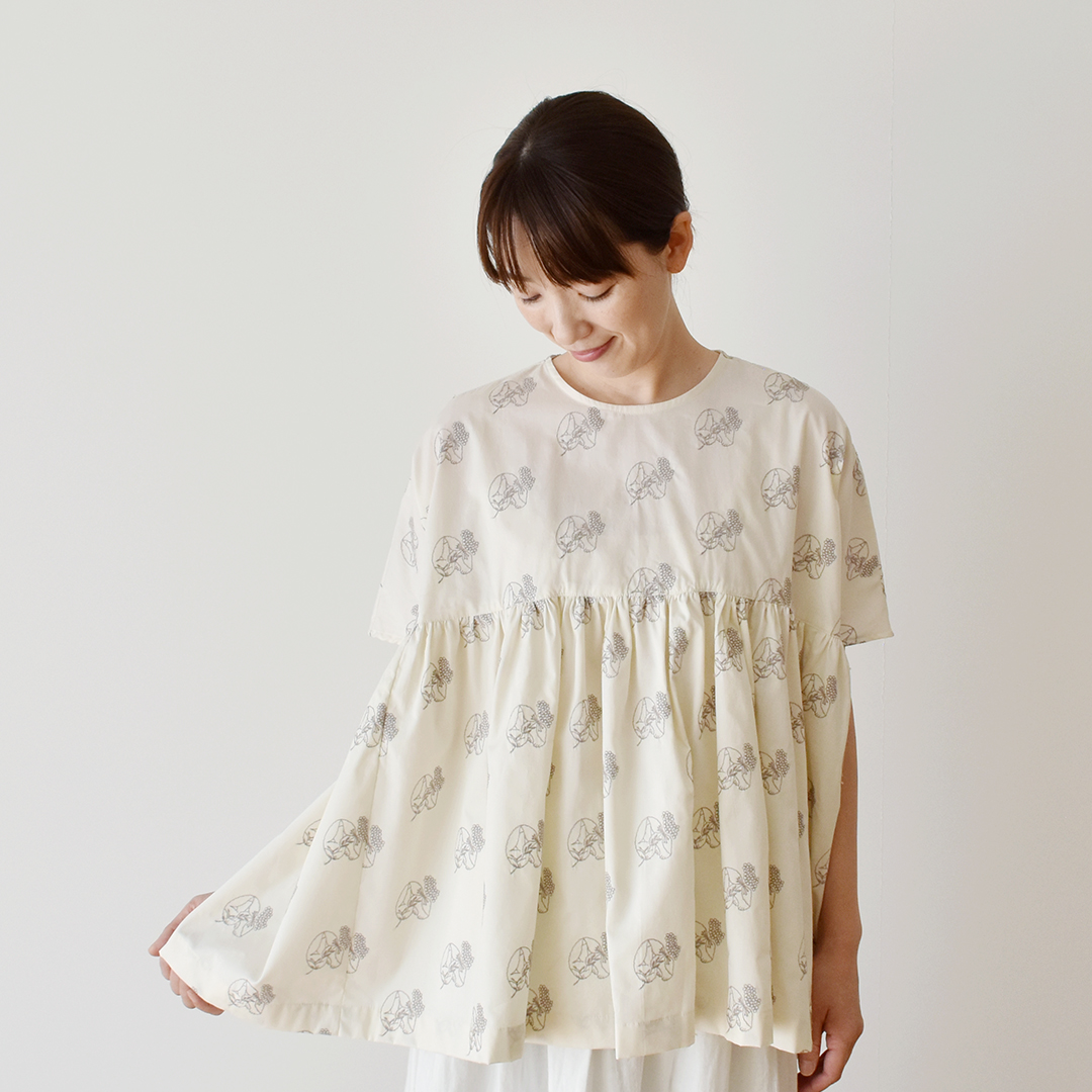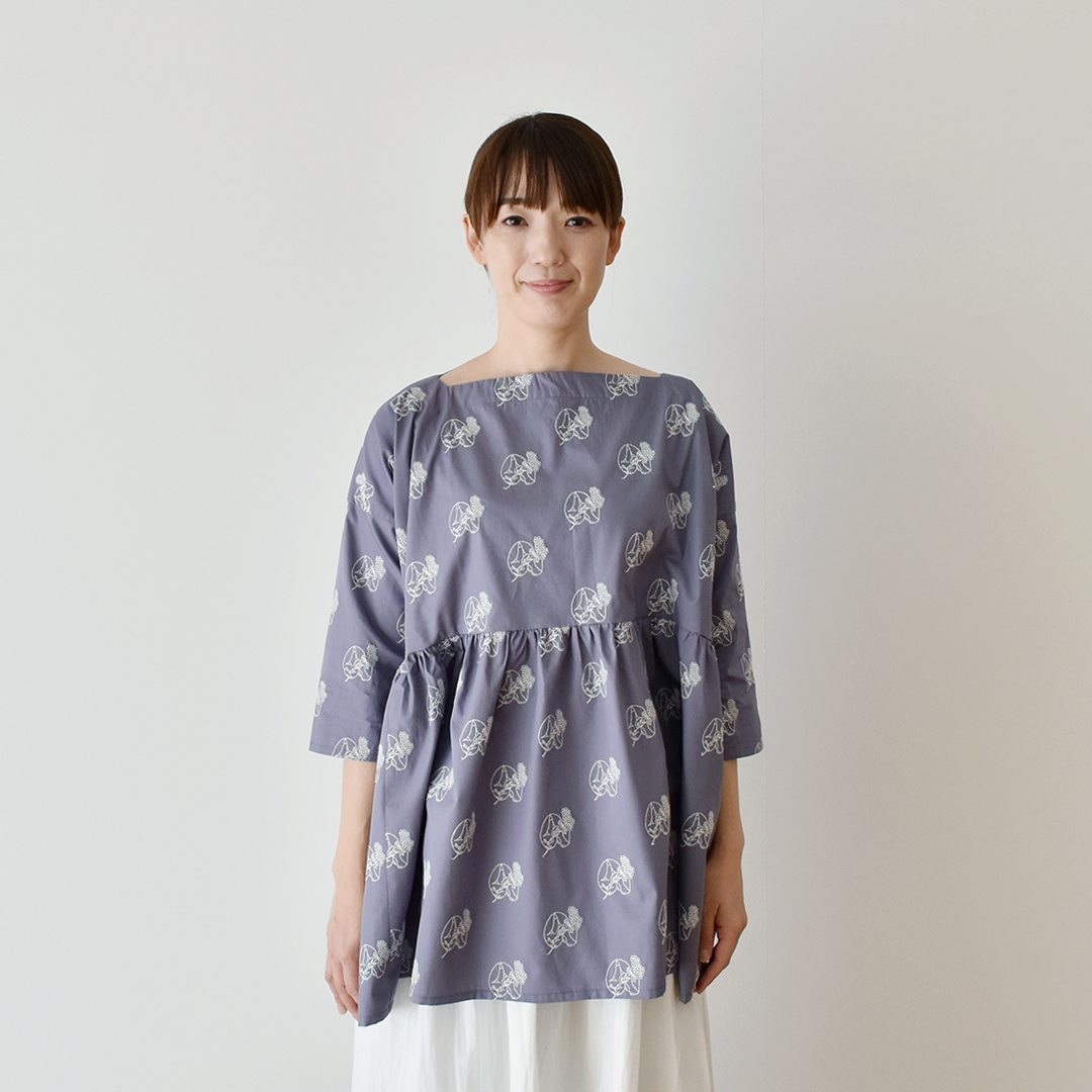 グレイッシュラベンダーにペールグレー:『CHECK&STRIPEのおとな服 ソーイング・レメディー』(文化出版局) スクエアネックのギャザーブラウス ※用尺:100cm幅×S 2.6m/M 2.7m/L 2.7m