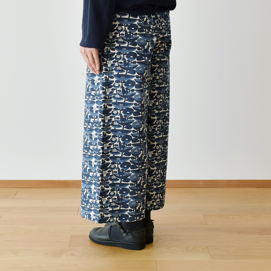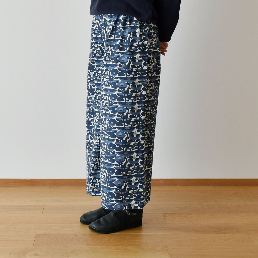 こちらの布をお買い上げのお客さまに、大人のワイドパンツのレシピをお付けします。(サンプル:ネイビー系) ※用尺:108cm幅×2m