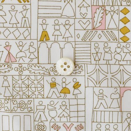 リバティ・ストアの一日を切り取った幾何学的なカンバセーショナル・デザインです。独特の木材の梁、彫刻が施されたパネル、ガラス窓が描かれ、買い物客が最新のファッションに目を輝かせる様子が描かれています。