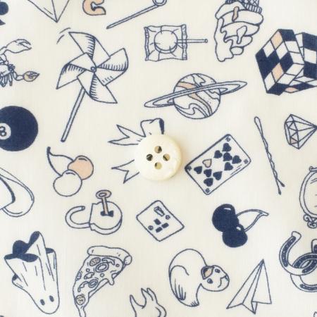 タトゥーアーティストのフラッシュシートにインスパイアされた楽しいカンバセーショナルデザインです。リバティデザインスタジオでファインライナーペンを使って作成されたこのパターンは、グラフィックのディテールの中に鮮やかな色彩が加わりさらにデザインを引き立てています。よく見ると、ラヴァランプ、サイコロ、惑星、クリップ、電球、さらにはバナナの皮といったユニークなオブジェクトの遊び心あふれる、まさにランダムさの無限の集まりです。