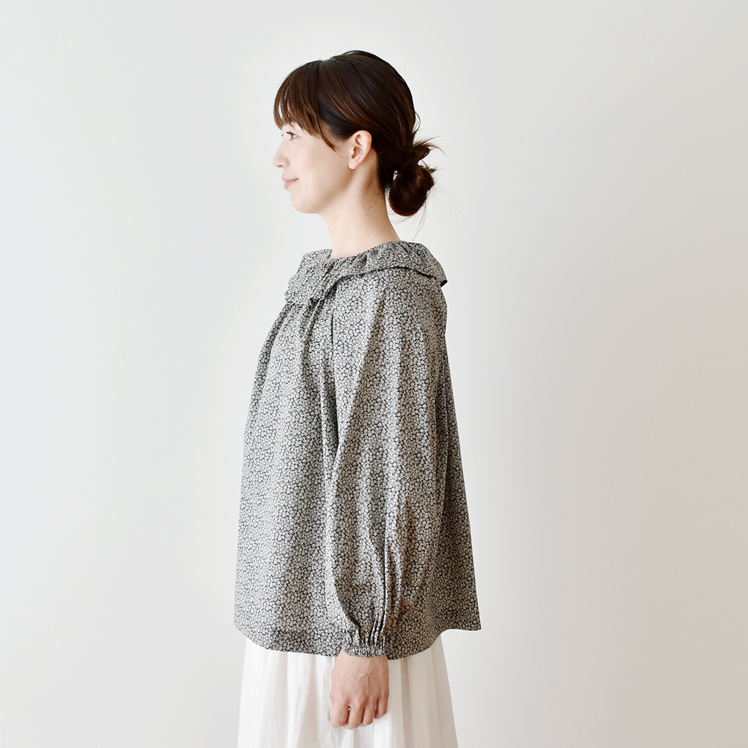 こちらの布をお買い上げのお客さまに、フリル衿のブラウスのレシピをおつけいたします。オンラインでは初めてご紹介するレシピです。(サンプル:◎J26C(フレンチ系)) ※用尺:108cm幅×2.5m