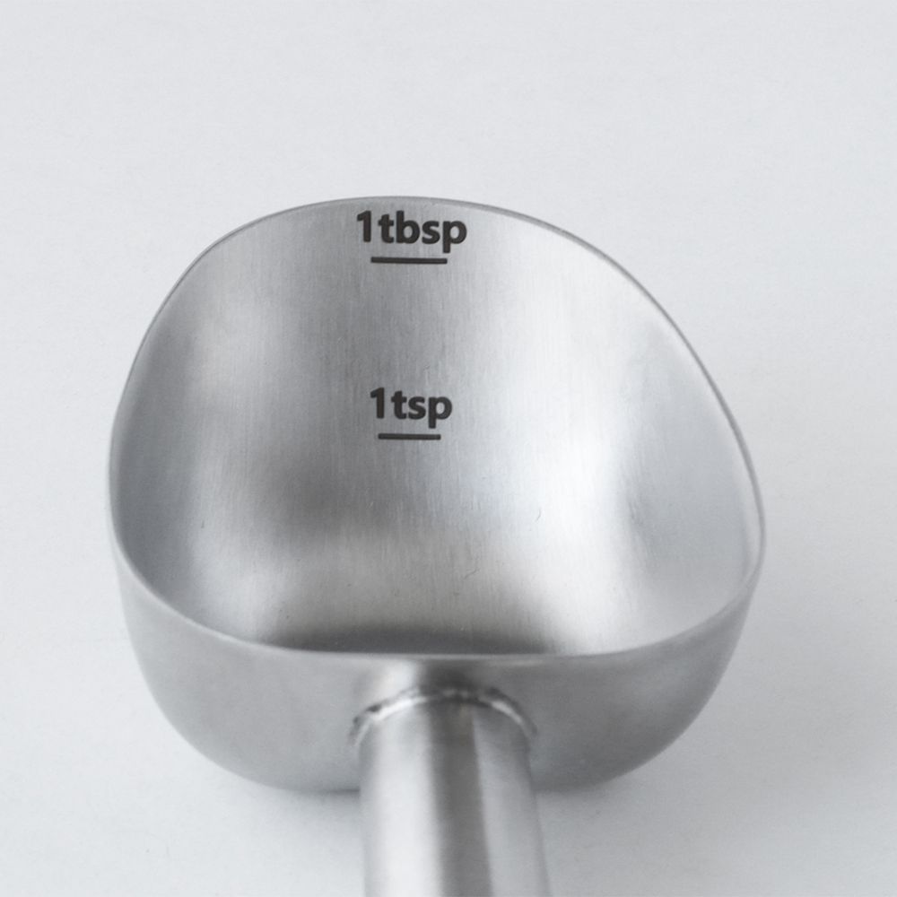 ステンレス製の計量スプーンは、スプーン部分に「tsp(小さじ:5ml)」「tbsp(大さじ:15ml)」と刻印されており、1本で大さじと小さじの両方を計量できます。底がフラットなので安定しやすく、正確に量ることができます。また、計量スプーンとしてだけでなくティースプーンとしても優秀です。アッサムティーのような細かい茶葉もすくいやすく、ポットに茶葉を入れやすい形状なので、ティースプーンとして使うのもおすすめです。食洗機にも対応しています。