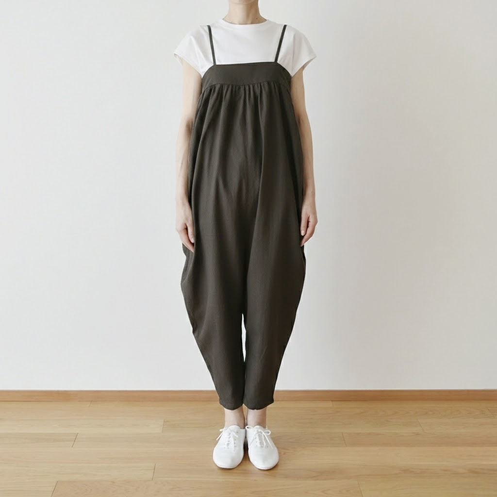 チャコールグレー:『CHECK&STRIPE COLOUR BOOK 色を楽しむソーイングブック』(文化出版局) 後ろゴムのギャザーサロペット