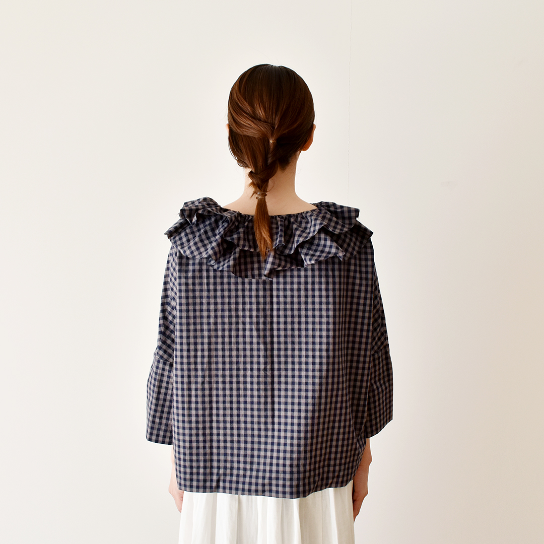 こちらの布をお買い上げのお客さまに、Dラインプルオーバー(フリル衿)のレシピをおつけいたします。オンラインでは初めてご紹介するレシピです。(サンプル: ネイビー×ミルクココア(7mm幅)) ※用尺 105cm幅×2.5m