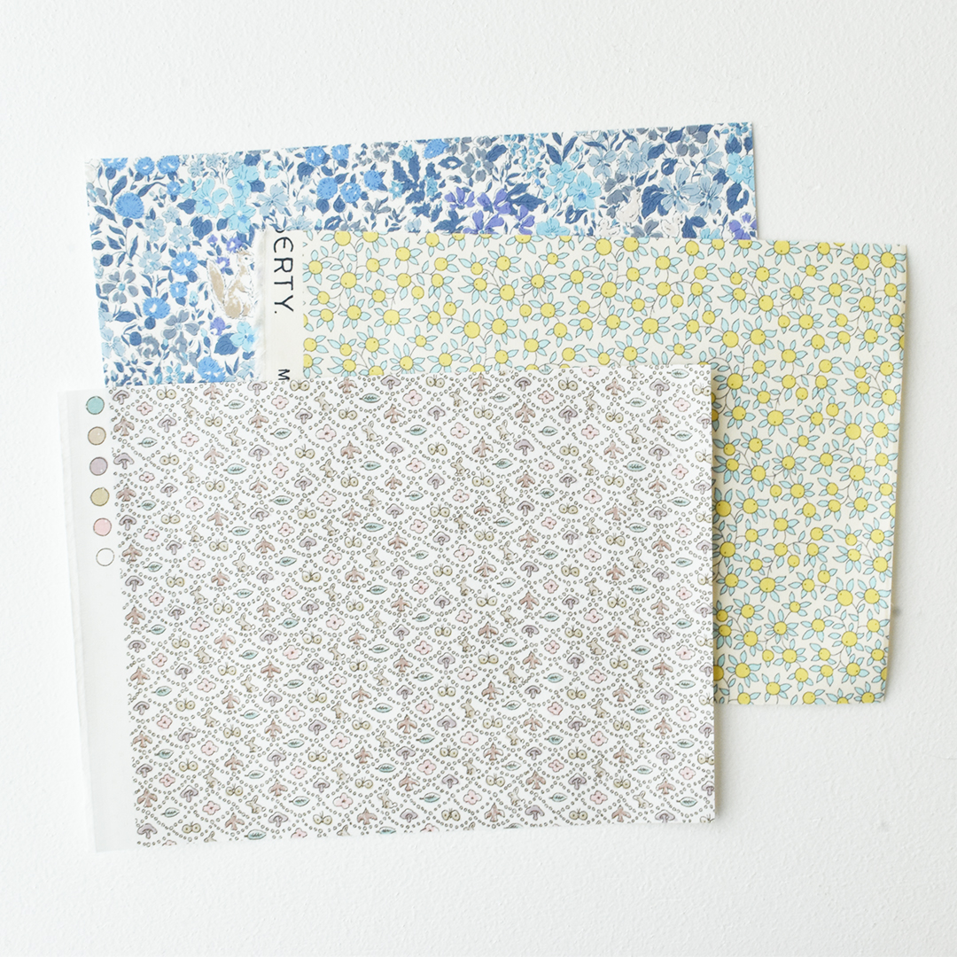 表面はリバティプリントの生地、裏面は白い紙が貼ってある、リバティプリントクラフトぺーパー。