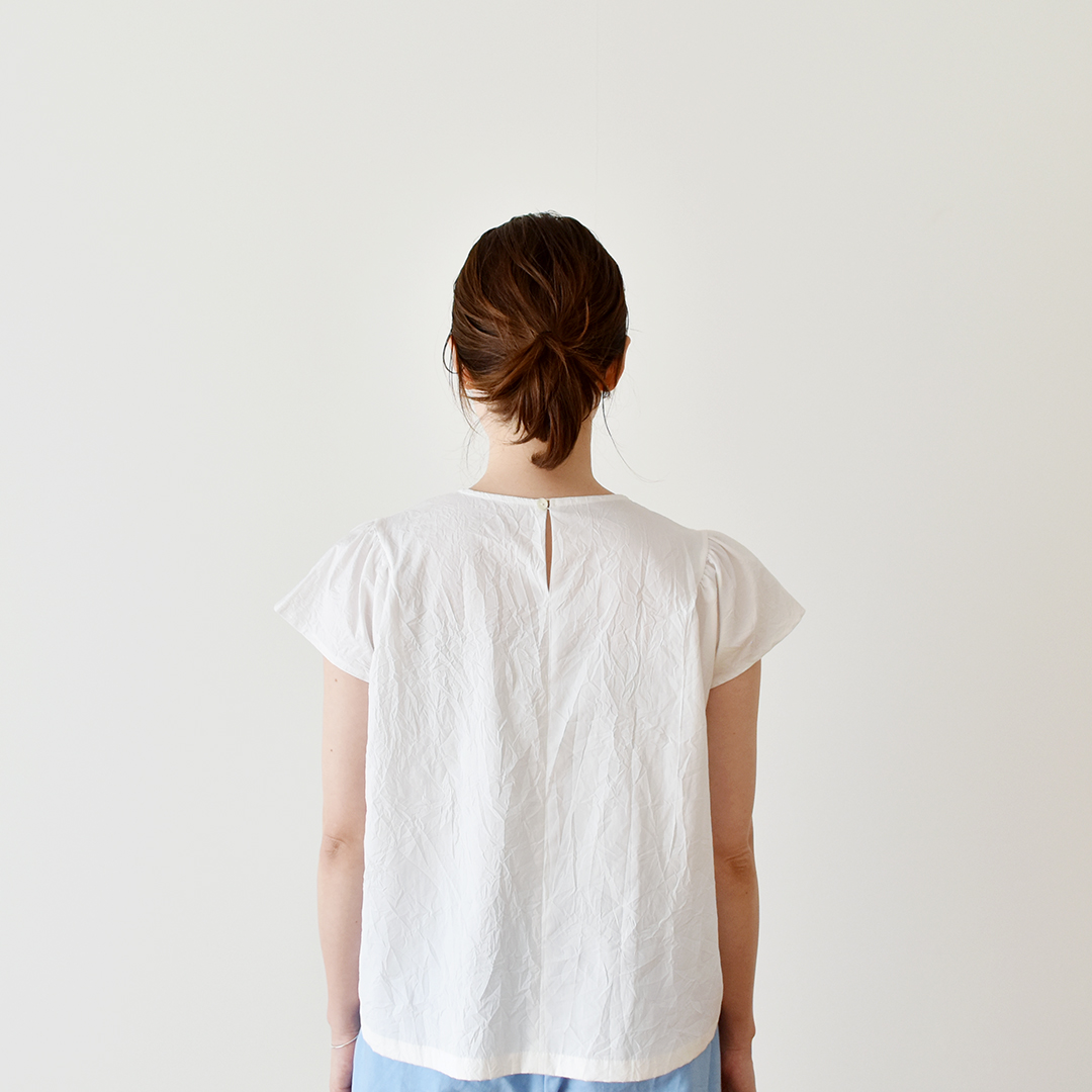 sunny days シリーズの布をお買い上げのお客さまに、ショルダーギャザーのフレンチスリーブブラウスのレシピをおつけいたします。(サンプル:ホワイト) ※用尺:110cm幅×1.6m