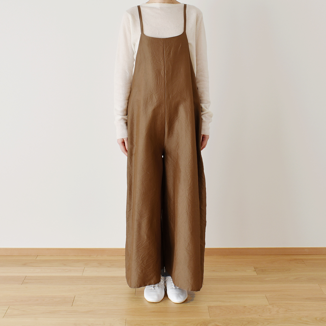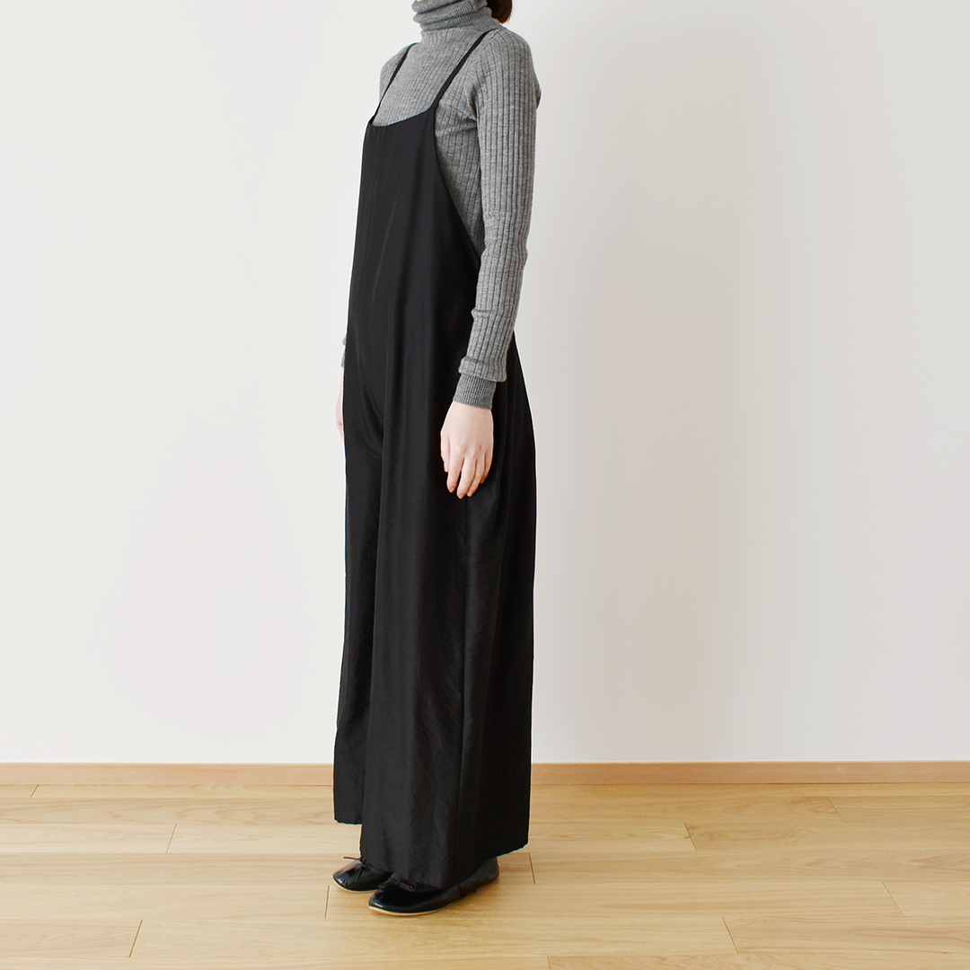 こちらの布をお買い上げのお客さまに、おまけレシピ「フレアパンツのサロペット(後ろギャザー)」のレシピをおつけいたします。(サンプル:ブラック) モデル身長:164cm ※用尺:110cm幅×3.5m