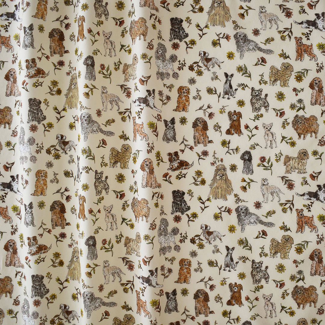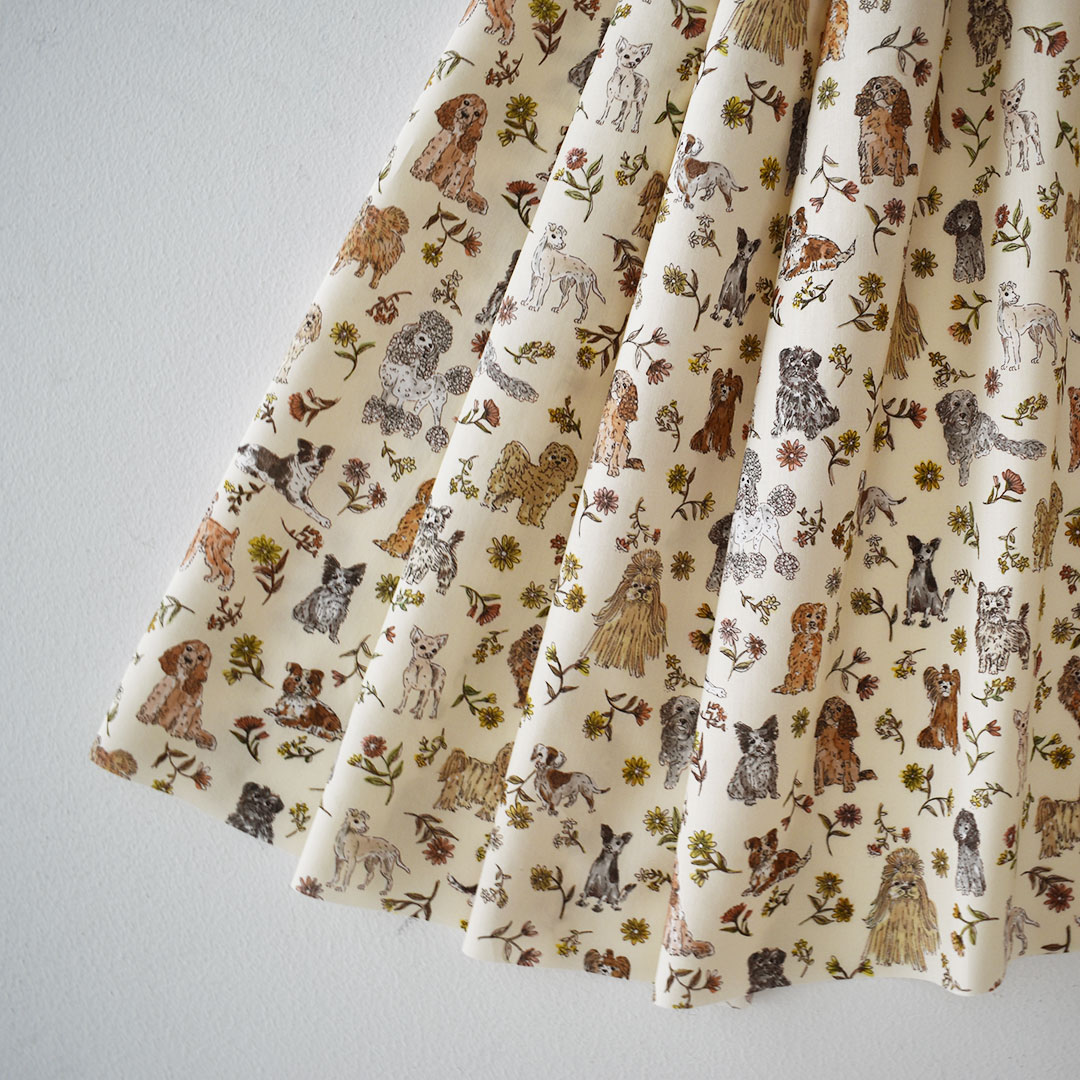 チワワ、キャバリア・キングチャールズ・スパニエル、ポメラニアン、トイプードル、シーズー、マルチーズ、テリアなどの小型犬種を中心に、愛らしい犬の仲間たちが描かれた作品です。スタジオで細いライナーペンを使って描かれたこの作品は、遊び心にあふれたインクのような色彩と、繊細な植物が、デザインにエネルギーと動きを与えています。