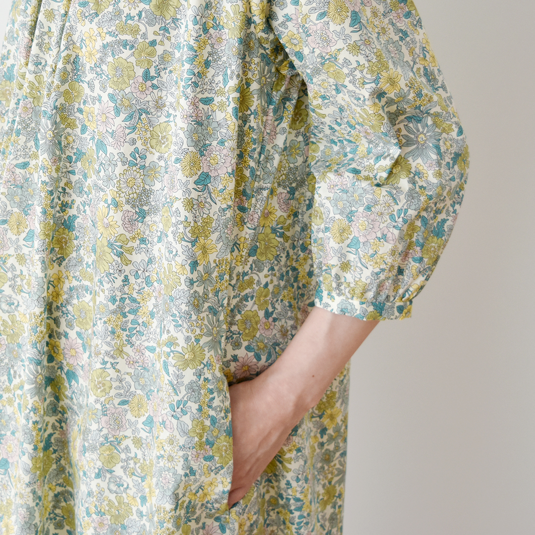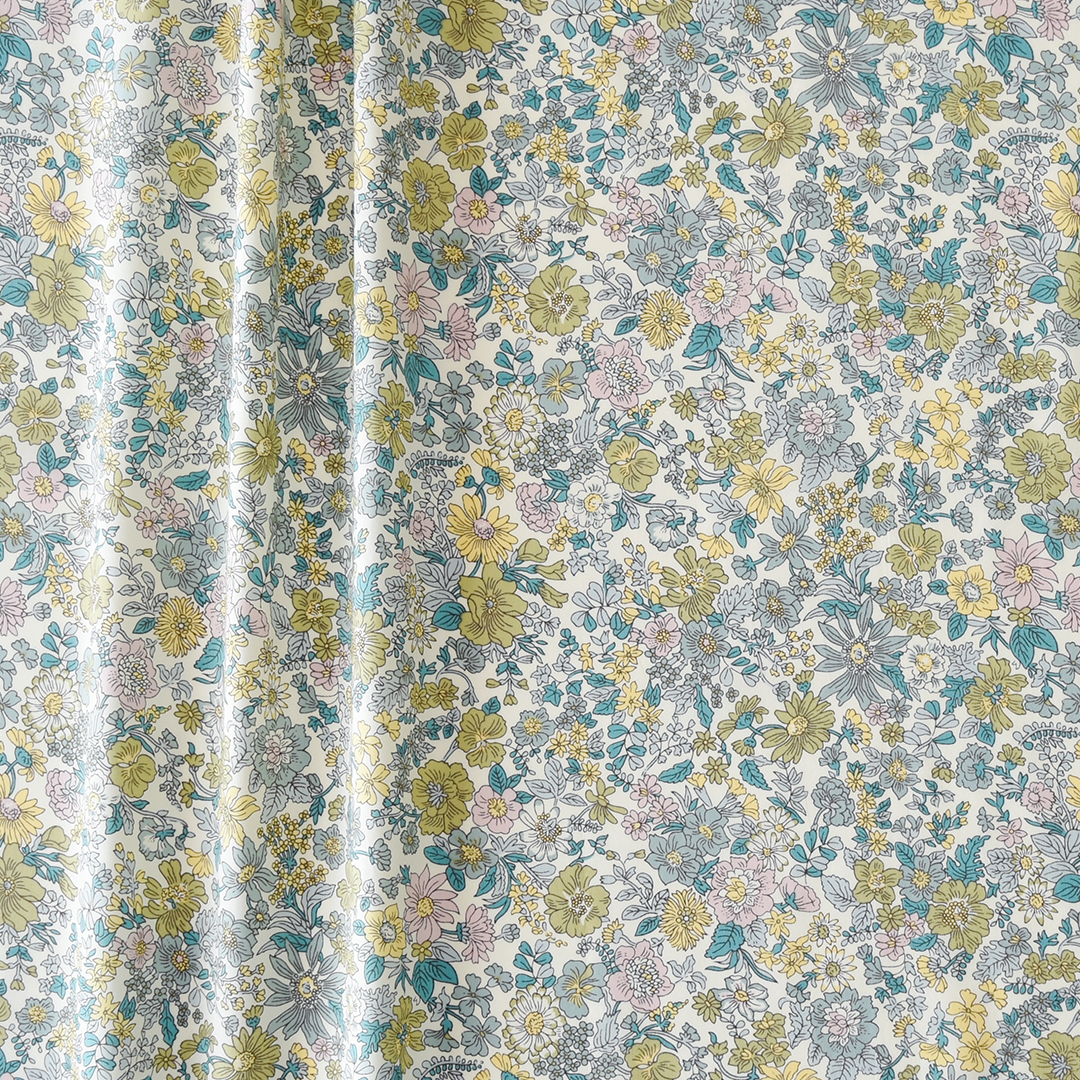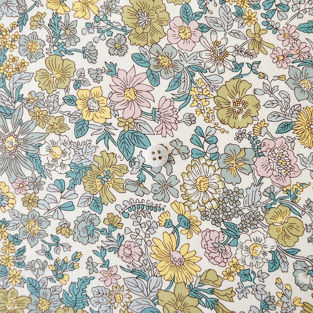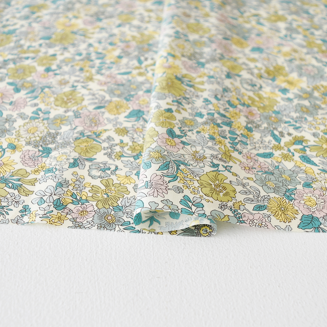 1993年にリバティのスタジオで再描画された「エミリー」は、1940年代のアーカイブプリントから着想を得ています。ヒナギクやマーガレットなどバラエティーに富んだ花を繊細な輪郭でラフに描かれ色付けされた中サイズの花柄です。