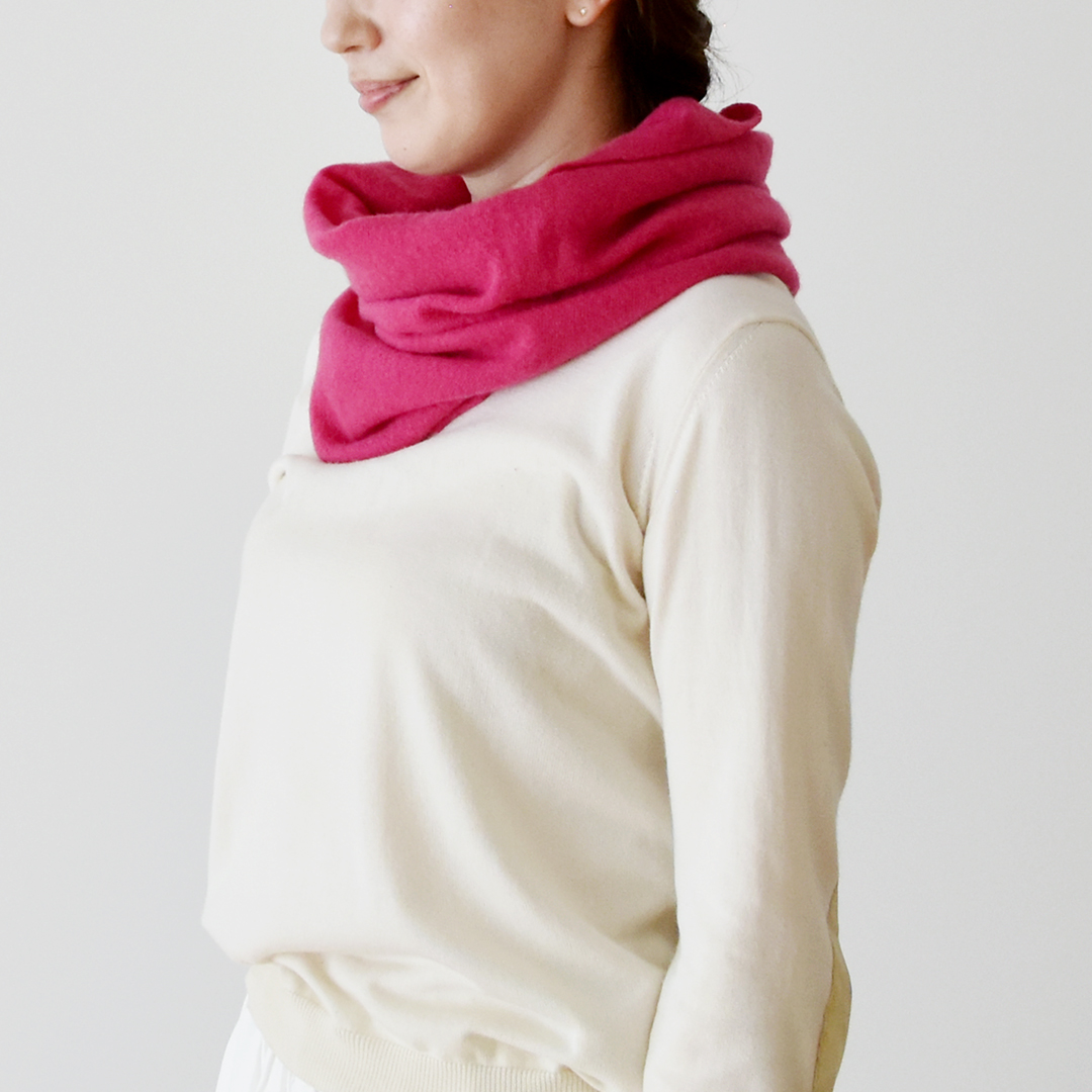 スヌードカットは、届いたままの輪の状態のままスッポリかぶってお使いいただいたり、切り開いてミニマフラーとされるなど2つの使い方があります。