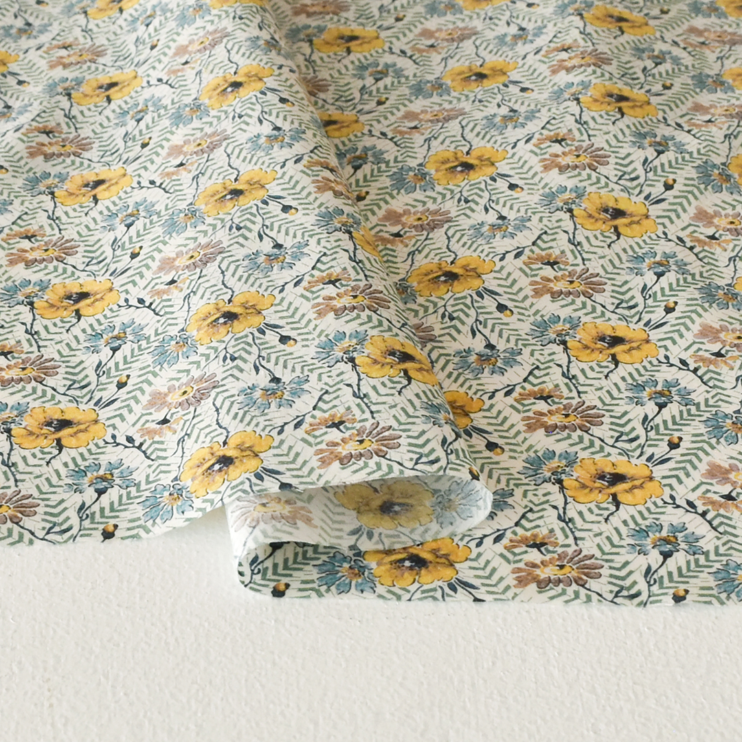 1920年代のリバティの試刷り紙をもとに、オリジナルの独特の質感と線描画を残しスタジオで丁寧に描きなおしました。ポピー、デイジー、コーンフラワー、ミニチュアのつぼみが、シェブロンの小枝で縁取られ、ギリシャ神話の収穫の女神にちなんで、トウモロコシの穂を思わせる幾何学的なフォルムに仕上げました。