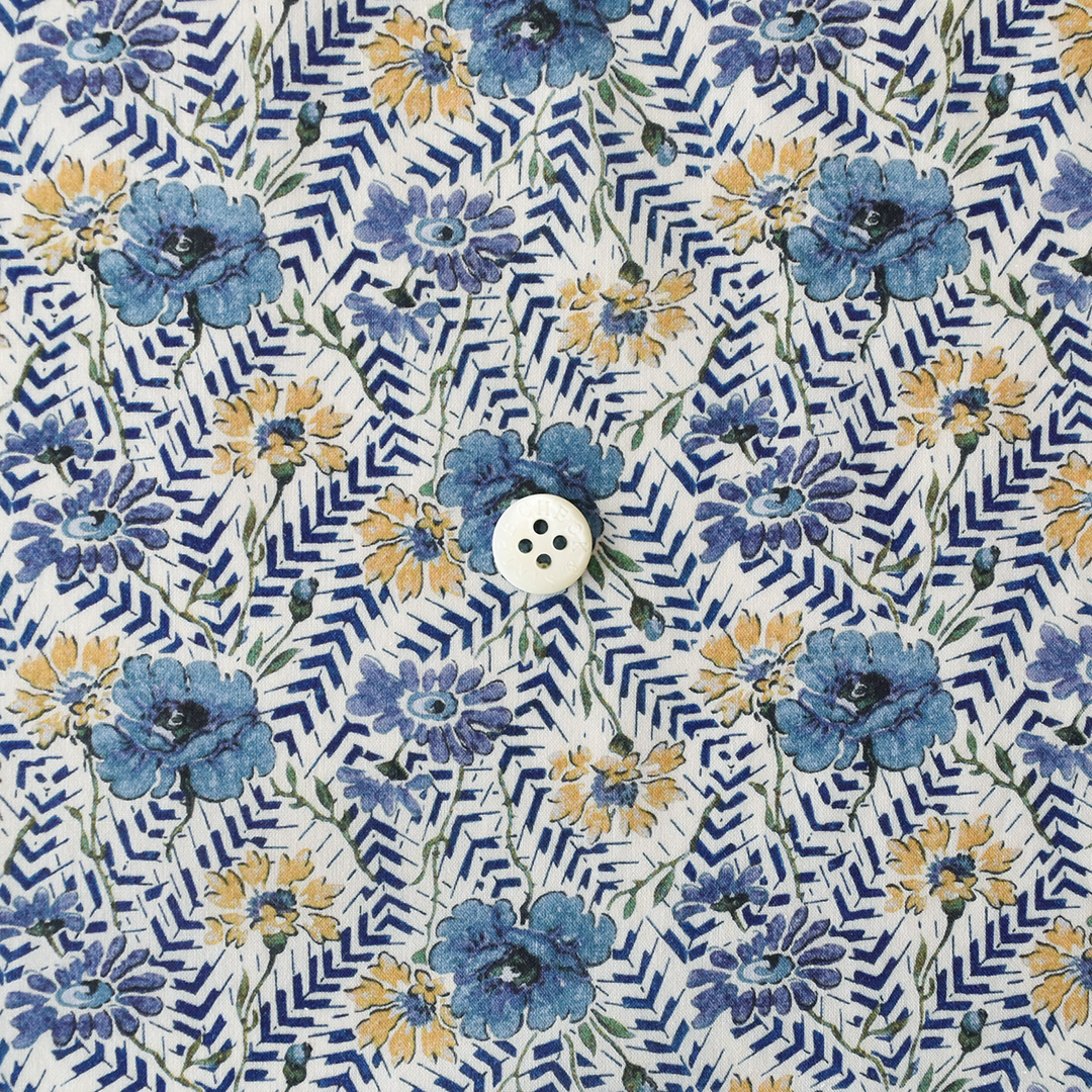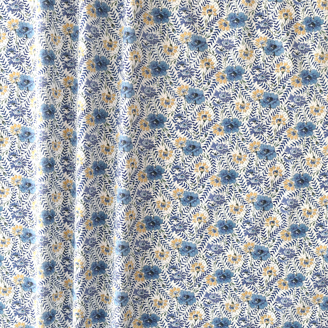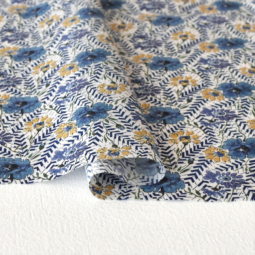 1920年代のリバティの試刷り紙をもとに、オリジナルの独特の質感と線描画を残しスタジオで丁寧に描きなおしました。ポピー、デイジー、コーンフラワー、ミニチュアのつぼみが、シェブロンの小枝で縁取られ、ギリシャ神話の収穫の女神にちなんで、トウモロコシの穂を思わせる幾何学的なフォルムに仕上げました。