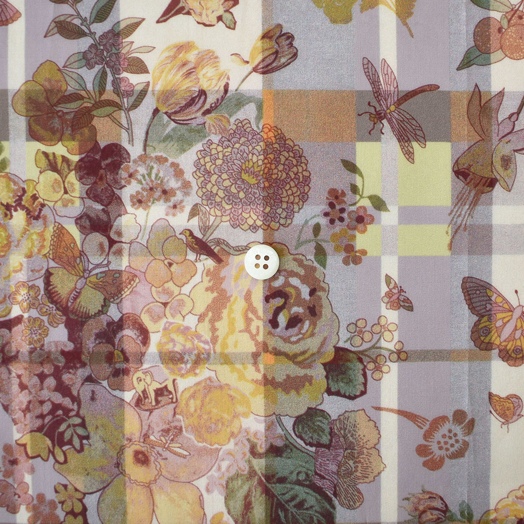2011年にリバティのデザインスタジオで描かれたオリジナルデザインに、同系色のチェックを背景に取り入れることでより魅力的なデザインになりました。この魅惑的なフローラル・カンバセーショナルデザインは、ヴィンテージ・ローズ、マリーゴールド、フクシア、パンジー、チューリップ、水仙、サクランボ、トンボ、蝶々で飾られたノスタルジックなブーケなど、大切な子供時代のイメージをデコパージュしています。