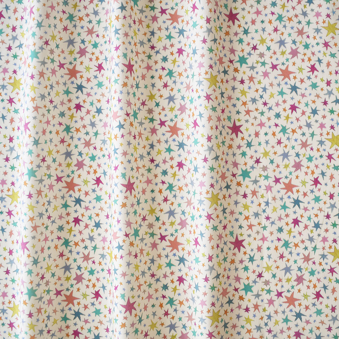 2000年に出版されたワイルドスミスの著書『If Only』では、数多くの生き物が自分を変身させることを想像しています。シマウマは様々な色の斑点を夢見、ヒョウは斑点の代わりに星のコートを夢見ています。そんな魅力的な星が描かれたのが、このプリントです。様々な色や形の星をたくさん並べ、輝きに満ちた多方向のデザインに仕上げました。