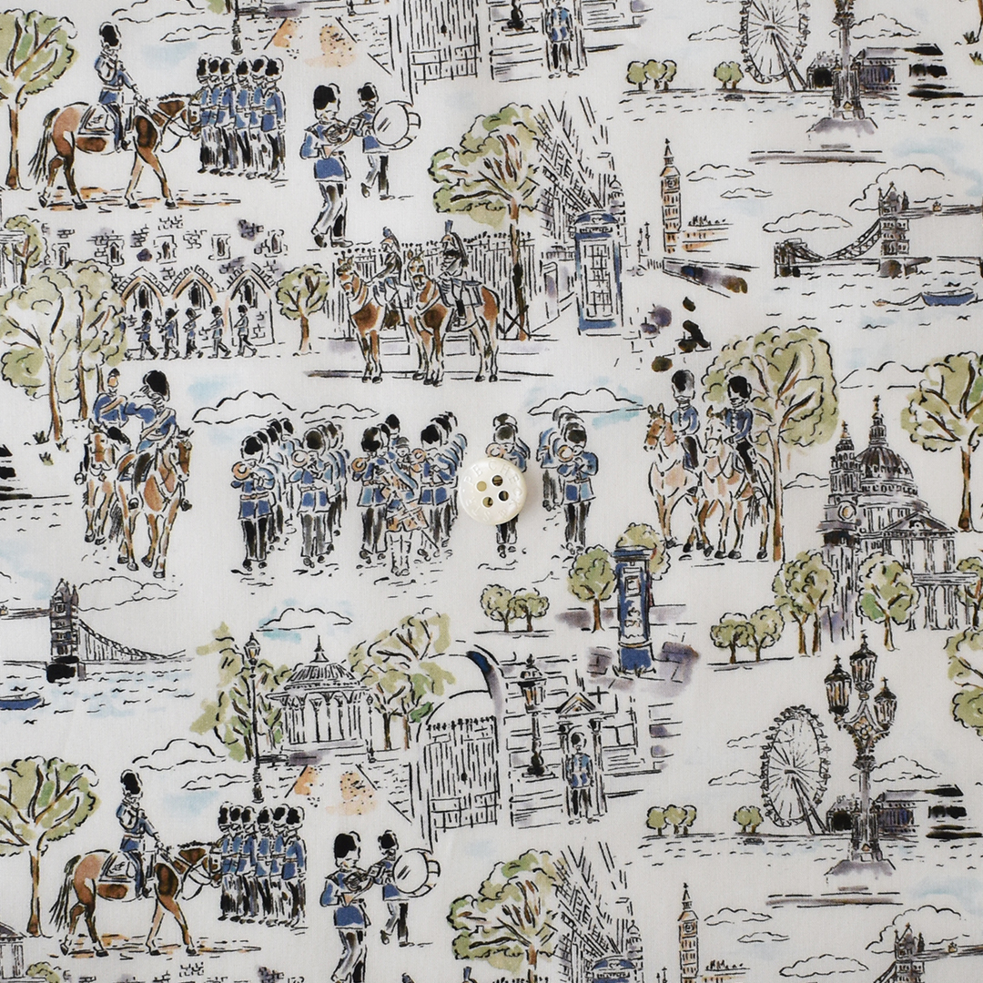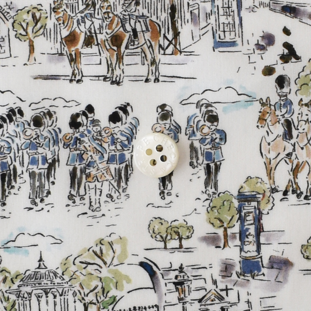 行進するバンドや馬に乗った衛兵たちがロンドンの名所を背景にパレードする様子を描いた、まさにイギリスらしいロンドンの風景を表現しています。卓越した芸術的技法で描かれ、インクと水彩を使った美しい手描きのイラストスタイルが特徴です。