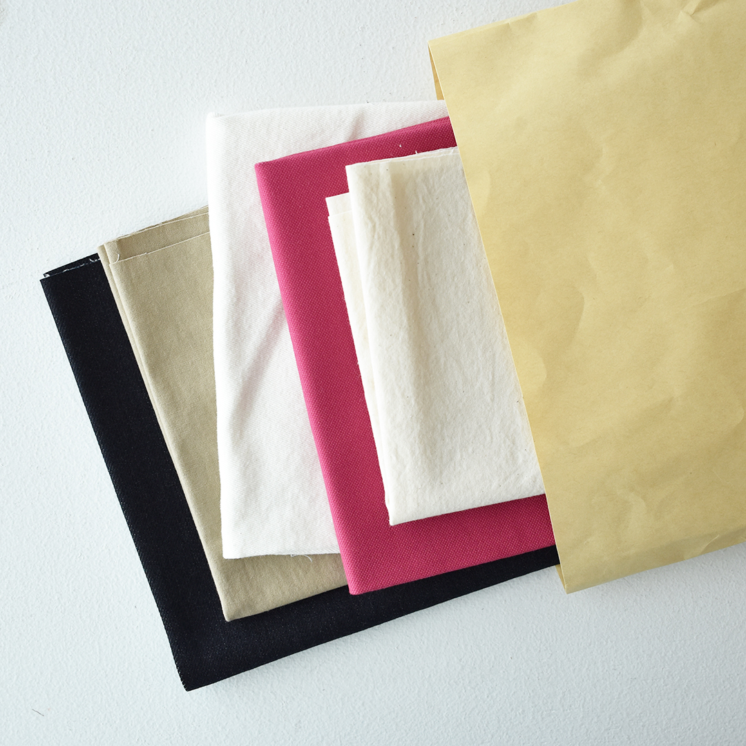 チノクロス・デニム・キャンバス・帆布・タイプライターなど3~4種類、合計1mの面積分のセットです。
