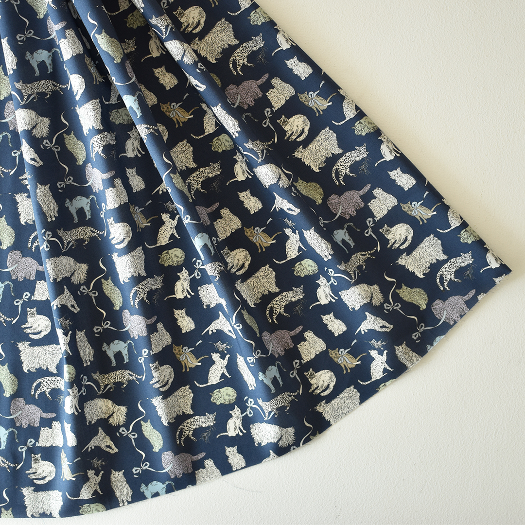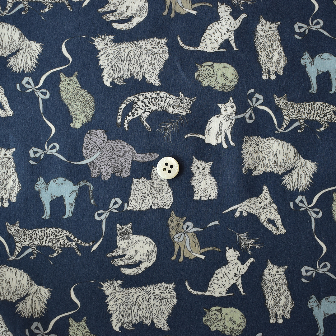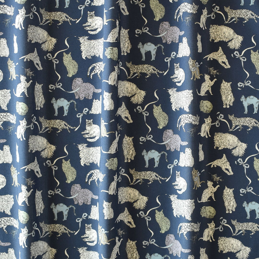 愛らしいキャラクター豊かな猫たちが、遊んだりくつろいだり、思い思いに動き回る会話のようなパターンです。リバティの人気デザイン「ミャウ(Meow)」から着想を得たこの新たな作品は、日本と英国のリバティスタッフが実際に飼っている猫たちをモチーフにしています。鉛筆で描かれたイラストは、リボンや蝶結びの間を遊び回る猫たちの愛らしい仕草と、自由でユーモラスな個性を見事に捉えています。