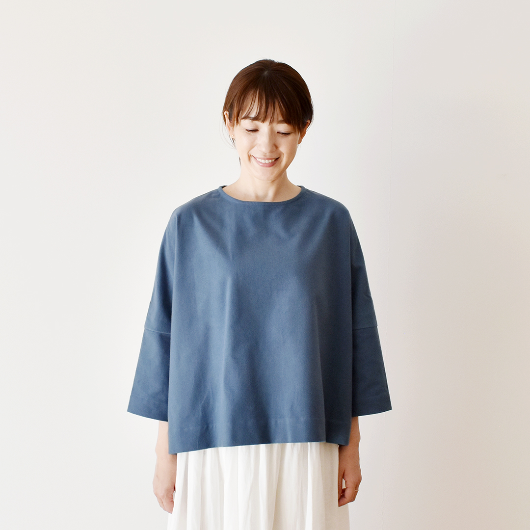こちらの布をお買い上げのお客さまに、Dラインプルオーバー/ワンピースのレシピをお付けいたします。衿ぐりが詰まっていて、肩線が斜め(Diagonally)で肩に沿うデザインです。 (サンプル プルオーバー:ナイトブルー) ※用尺(プルオーバー/ワンピース):110cm幅×2m/2.9m