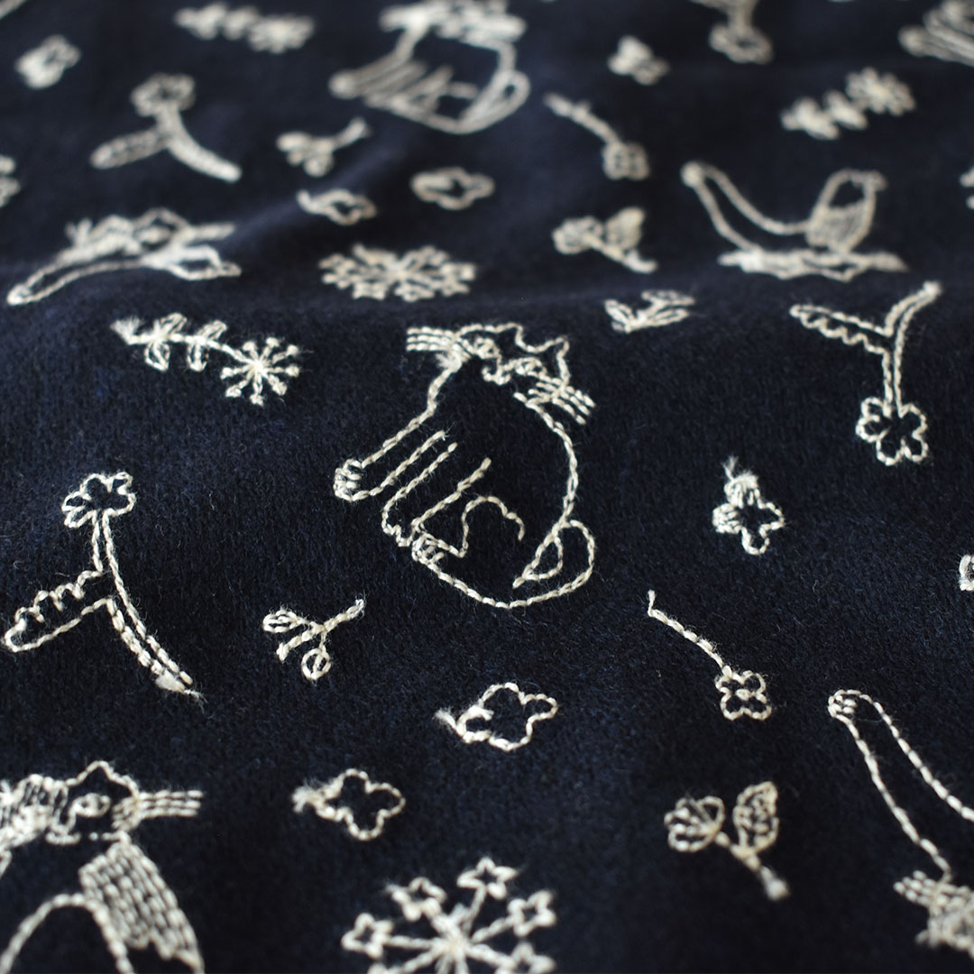 軽くてやわらかな風合いのウールに、中西なちおさんが描かれたネコと可愛らしいお花の刺繍が施されています。