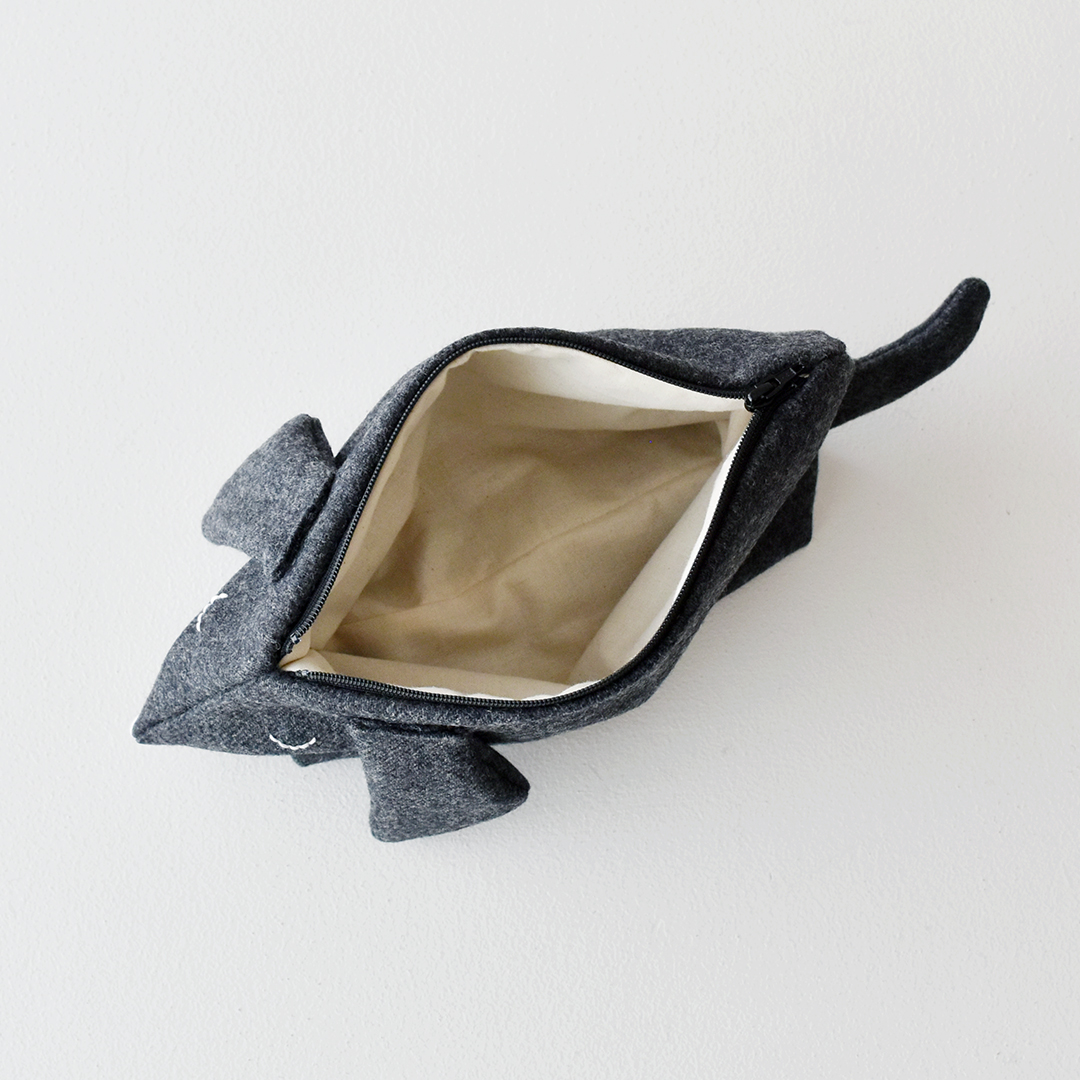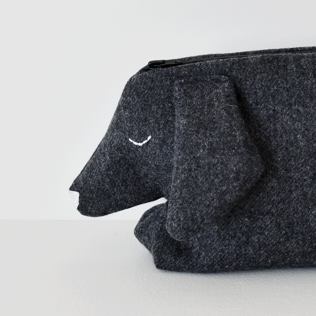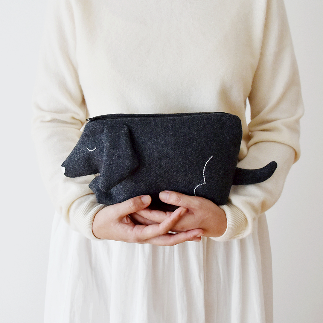 あたたかみのあるウールの生地で作るくったりしてかわいい犬のかたちのポーチです。ゆったりした大きさで化粧品や充電器などいろいろな小物を入れることができます。