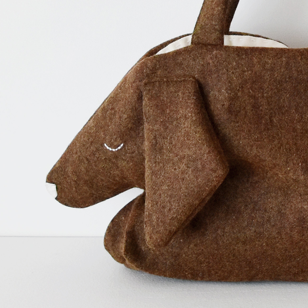 あたたかみのあるウールを使ったくったりしてかわいい犬のかたちのバッグです。お財布、携帯電話、ポーチ、ハンカチなどを入れてもゆったりするくらいのサイズです。