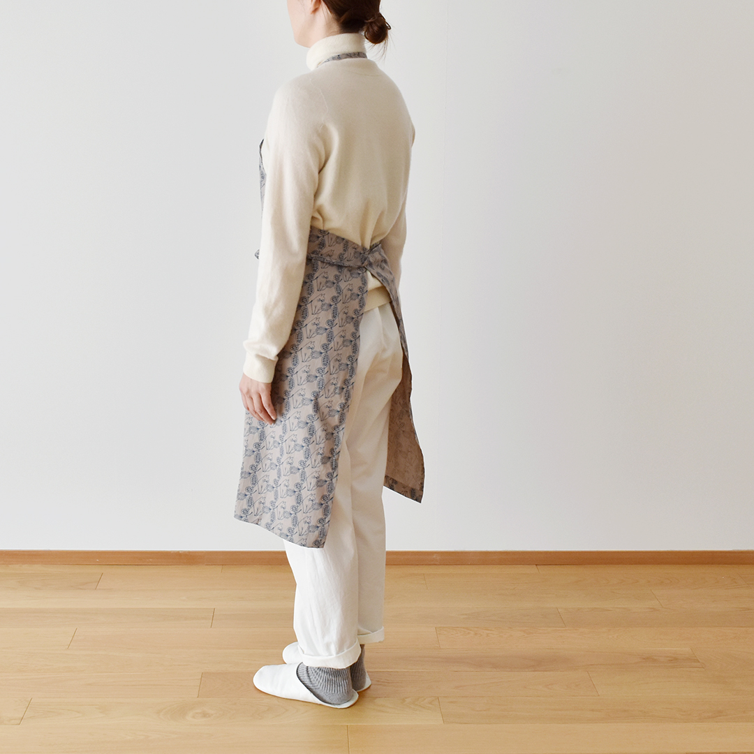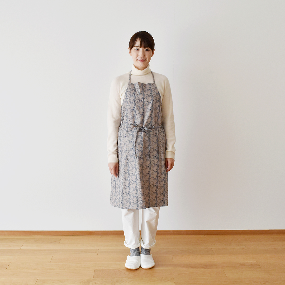 こちらの布をお買い上げのお客さまに、カフェエプロンのレシピをお付けします。(サンプル:ソイラテにブルー) ※用尺:108cm幅×1m