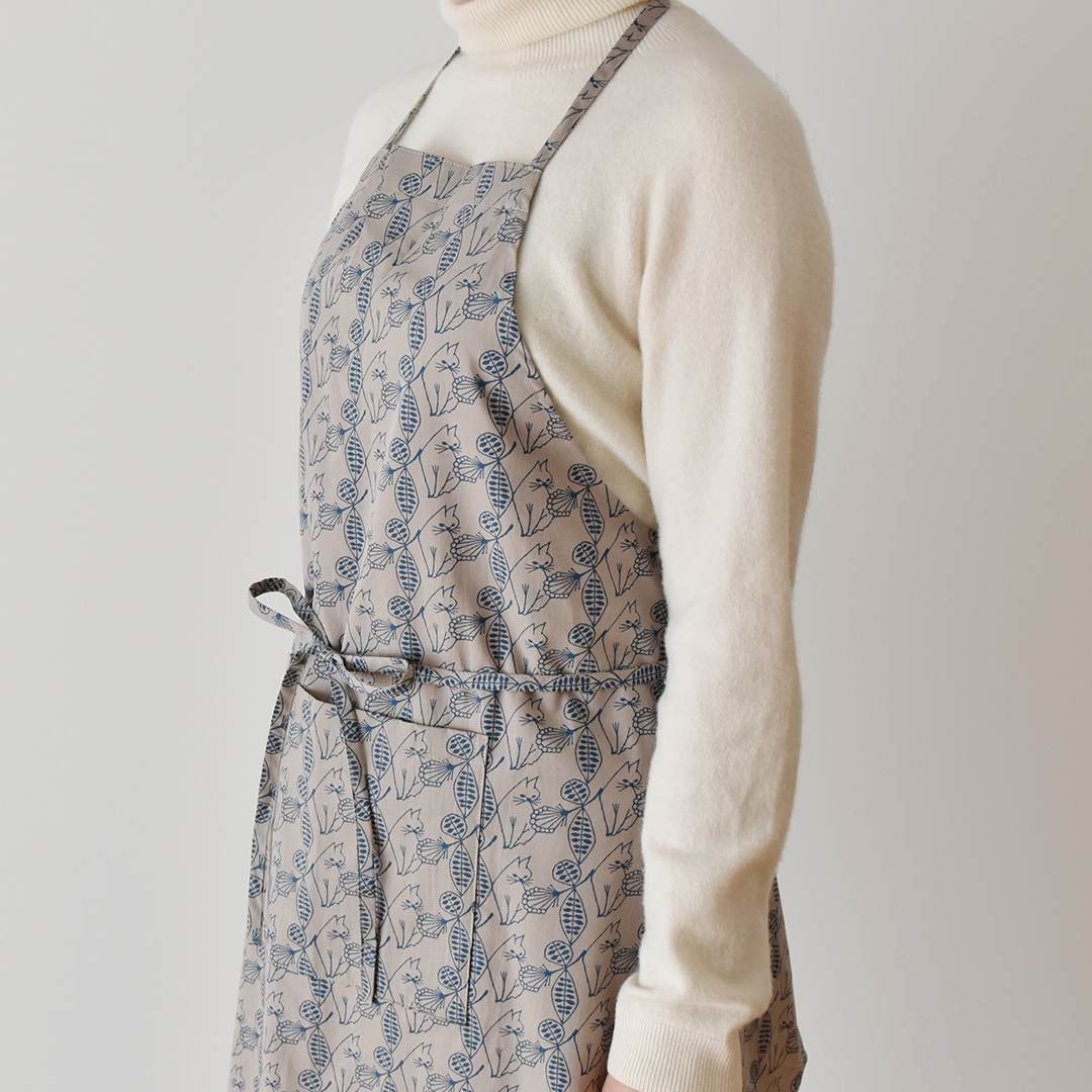 こちらの布をお買い上げのお客さまに、カフェエプロンのレシピをお付けします。(サンプル:ソイラテにブルー) ※用尺:108cm幅×1m