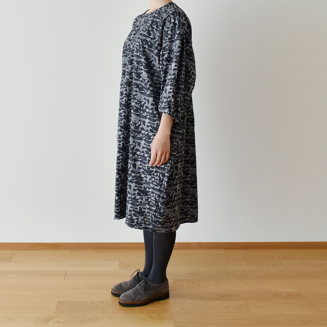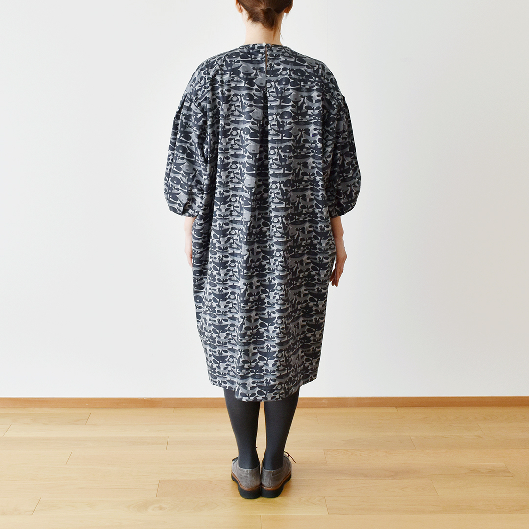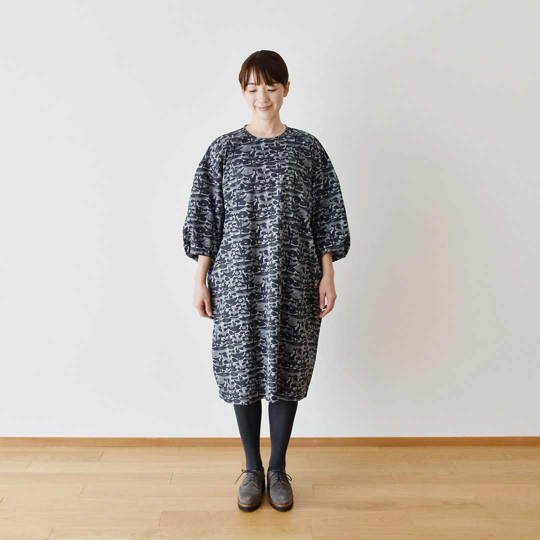 グレー系:『CHECK&STRIPE her closet あのひとの装い』(主婦と生活社) バルーン袖のワンピース ※用尺:108cm幅×S 3.3m/M 3.4m/L 3.5m