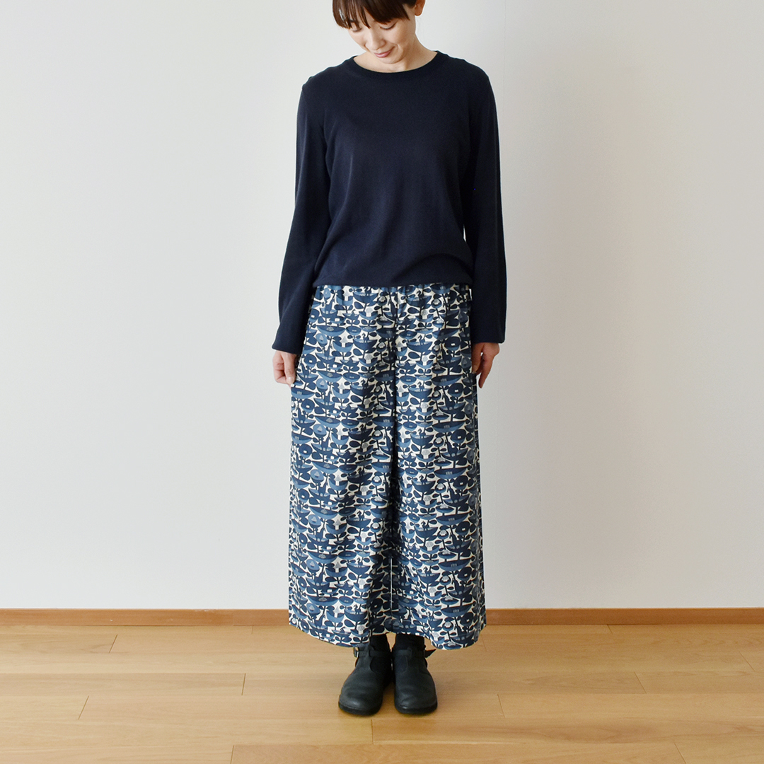 こちらの布をお買い上げのお客さまに、大人のワイドパンツのレシピをお付けします。(サンプル:ネイビー系) ※用尺:108cm幅×2m