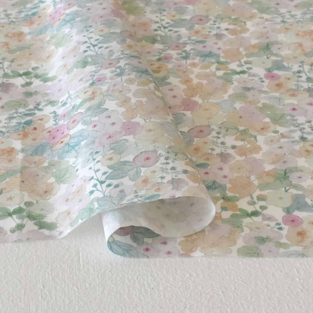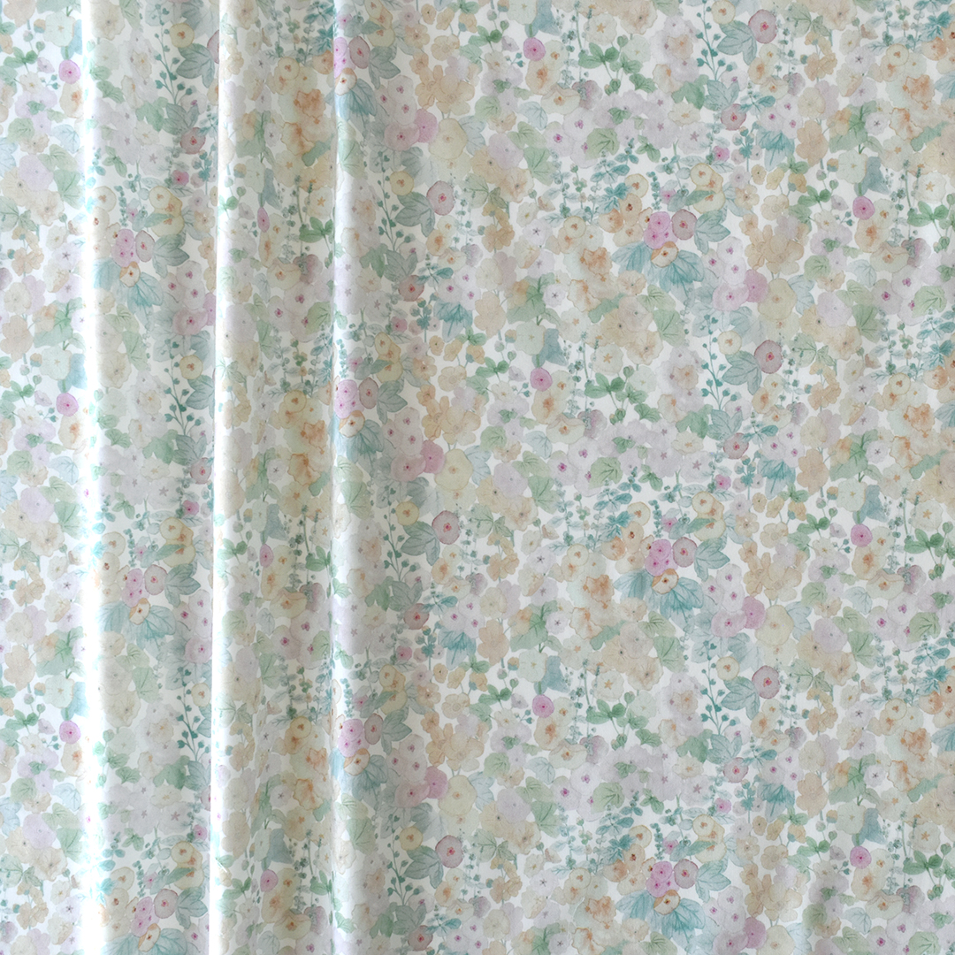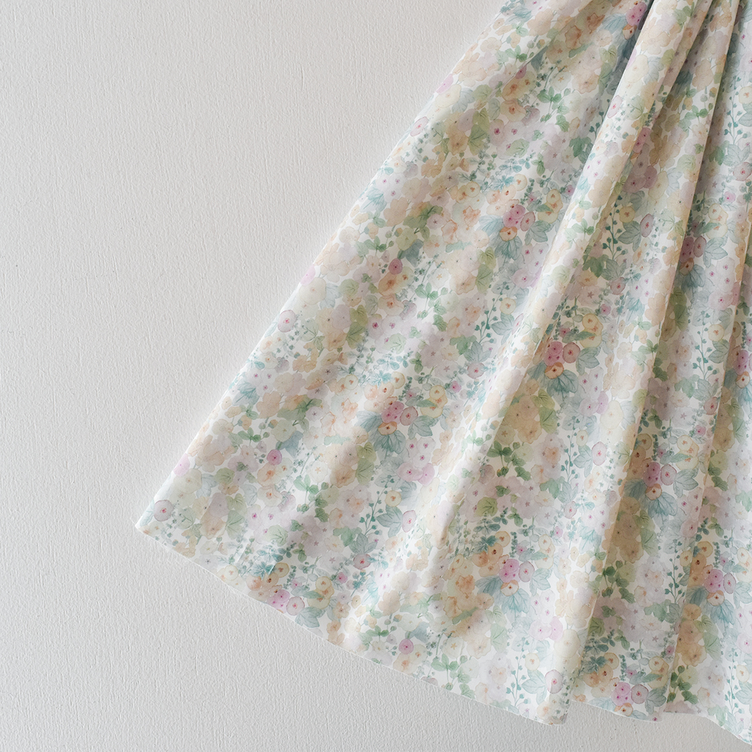 典型的なイングリッシュガーデンに咲く沢山のタチアオイからインスピレーションを受け水彩で描かれました。ソフトな色調が、光と影の優しいニュアンスに満ちた夢のようなデザインを作り出しています。イングリッシュガーデンを象徴するこの花は、無邪気さ、純粋さ、そして穏やかさを表現しています。