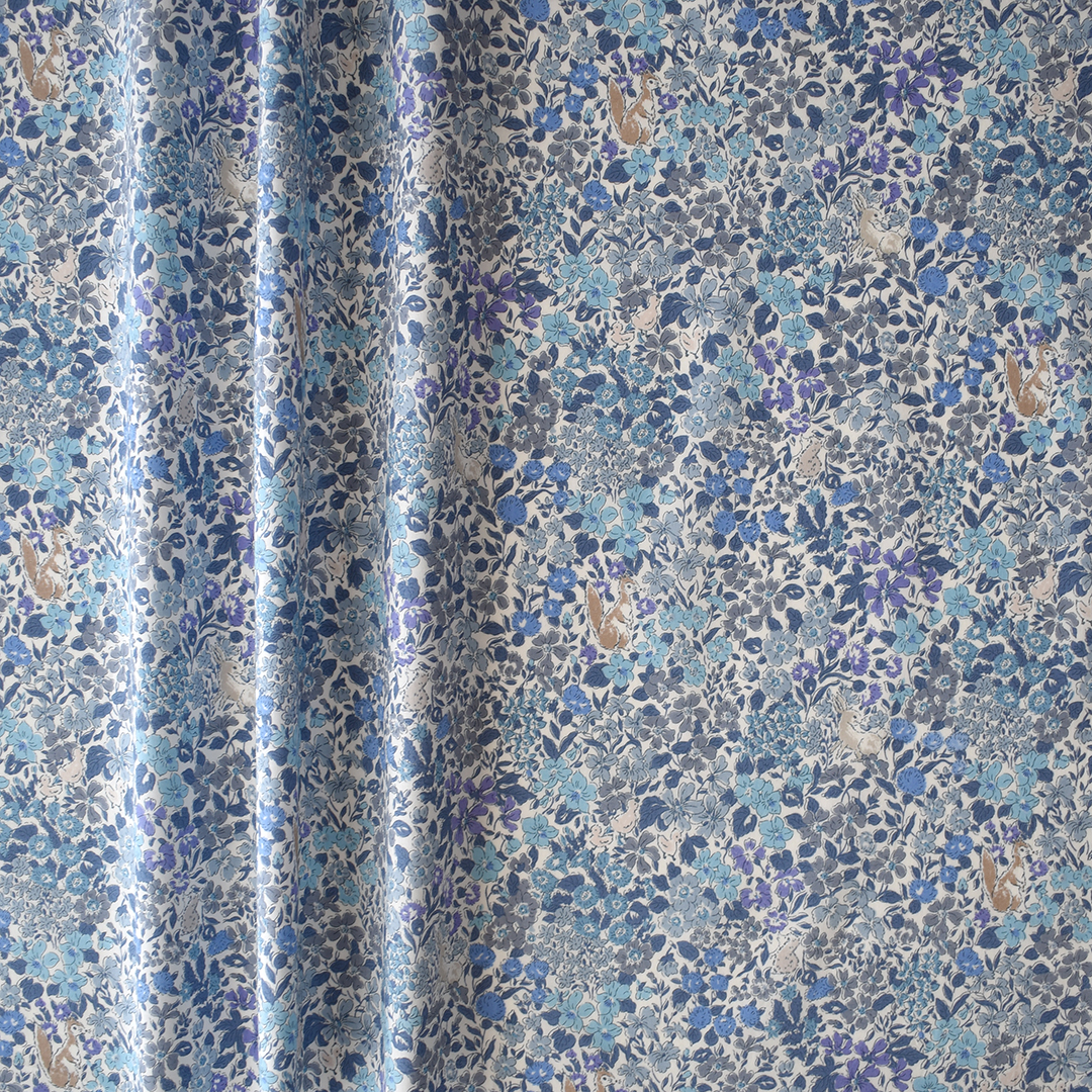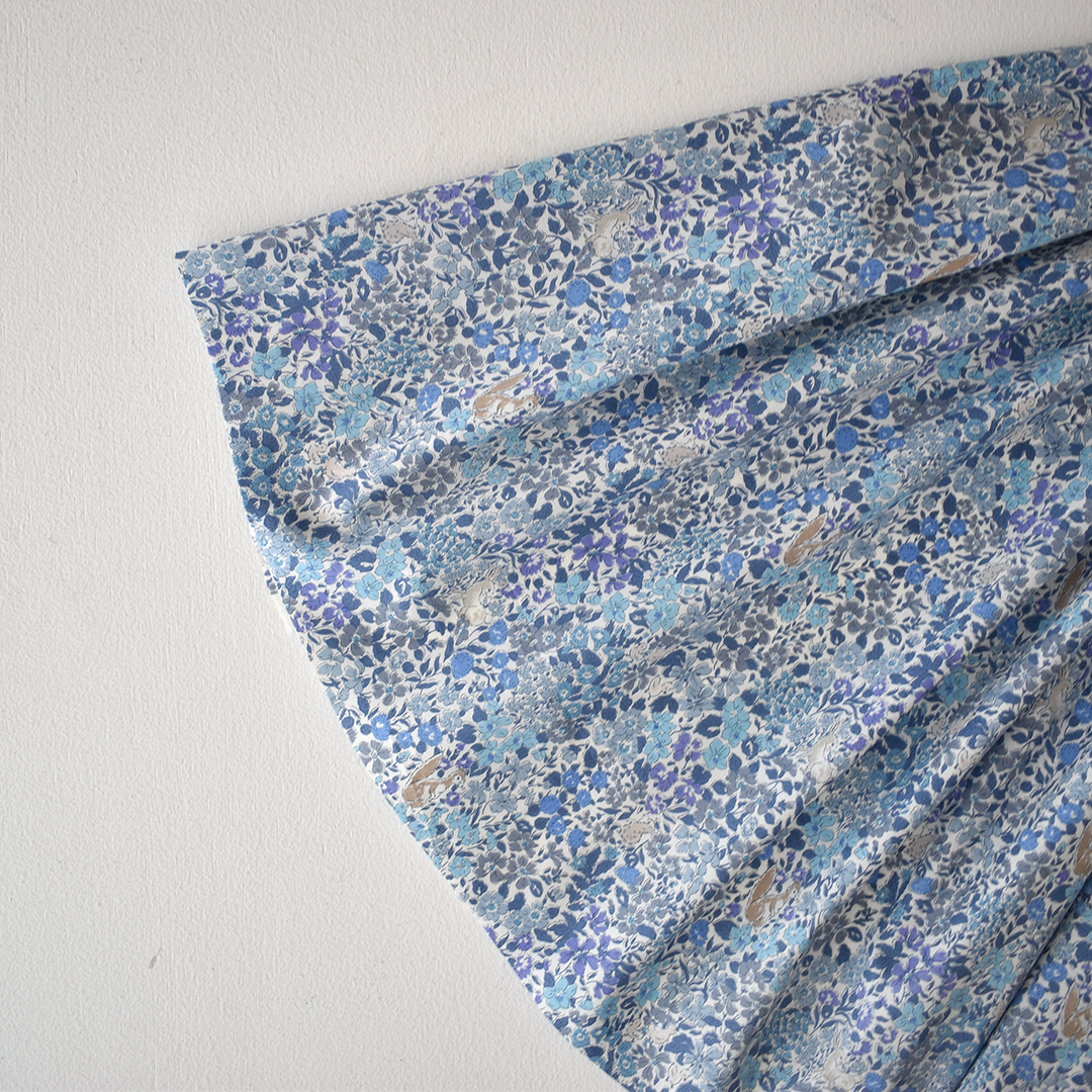 アザミ、ナデシコ、バラ、そしてアフリカホウセンカが咲き乱れる牧草地でウサギやリス、アヒルやハリネズミが遊んでいるそんな可愛い柄です。