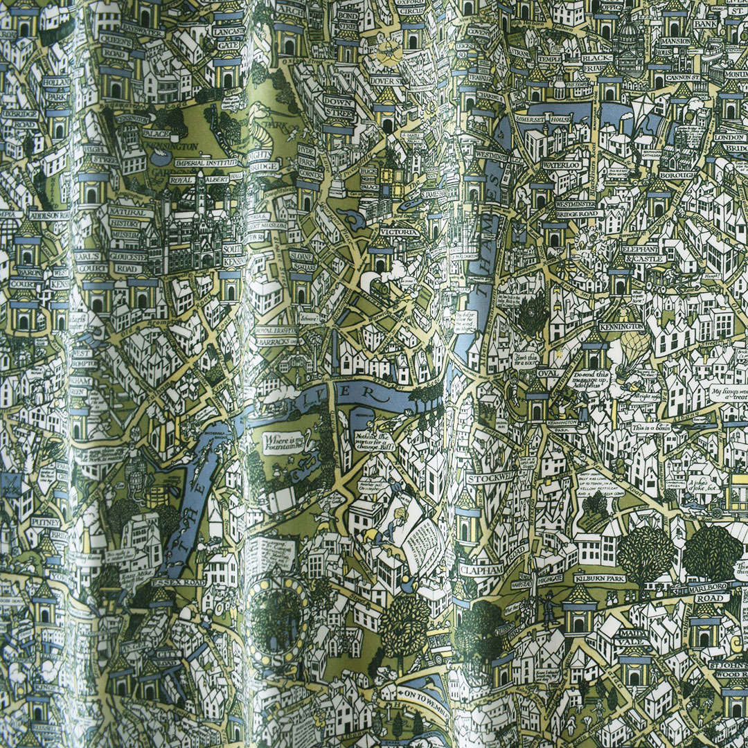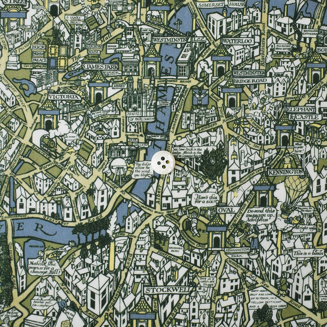 ルイス・キャロルの「不思議の国のアリス」からインスピレーションを得て1924年に描かれた、アンティークのロンドン中心部の風刺画地図にインスパイアされたデザインです。ロンドンのランドマークである地下鉄の駅や重要な建築物の立面図、奇妙な背景、難解な言及やダジャレで埋め尽くされています。