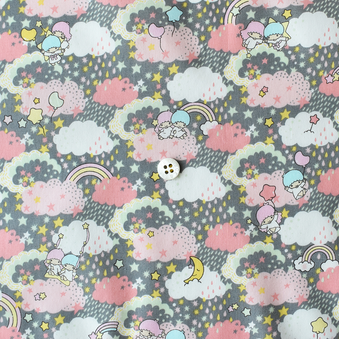 星空と枕のように柔らかな雲が夢の国の様です。きらめく星と輝く雨摘が子供時代の思い出を連想させるこの魅力的なプリントは、ロバート・ルイス・スティーヴンソンによる「子供の詩の園」の詩をベースに2015年に作られました。今回のコラボレーションのために、この魔法のようなリバティの世界にリトルツインスターズが加わり、さらに楽しそうなプリントになりました。ⓒ 2025 SANRIO CO., LTD. APPROVAL NO. L656909 -