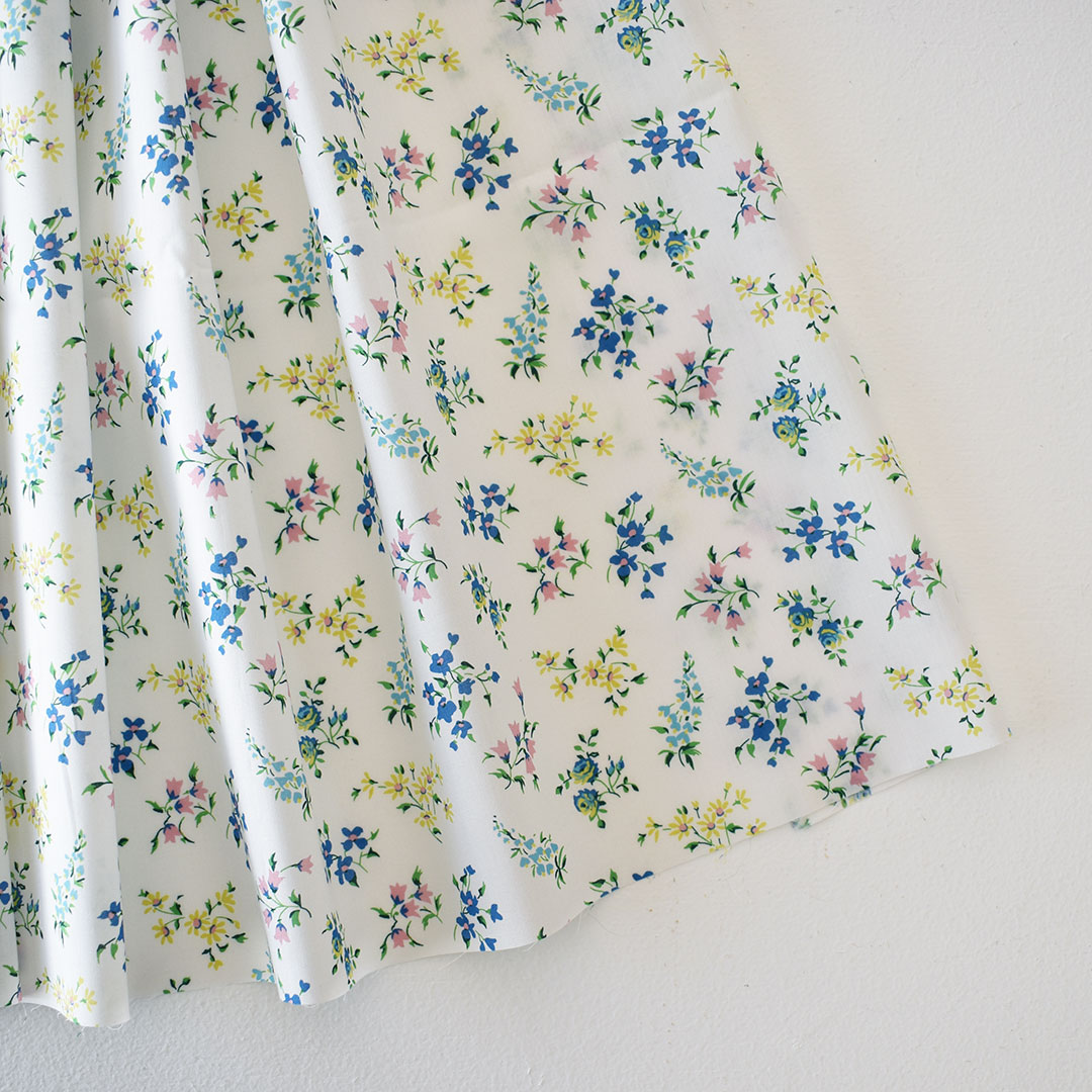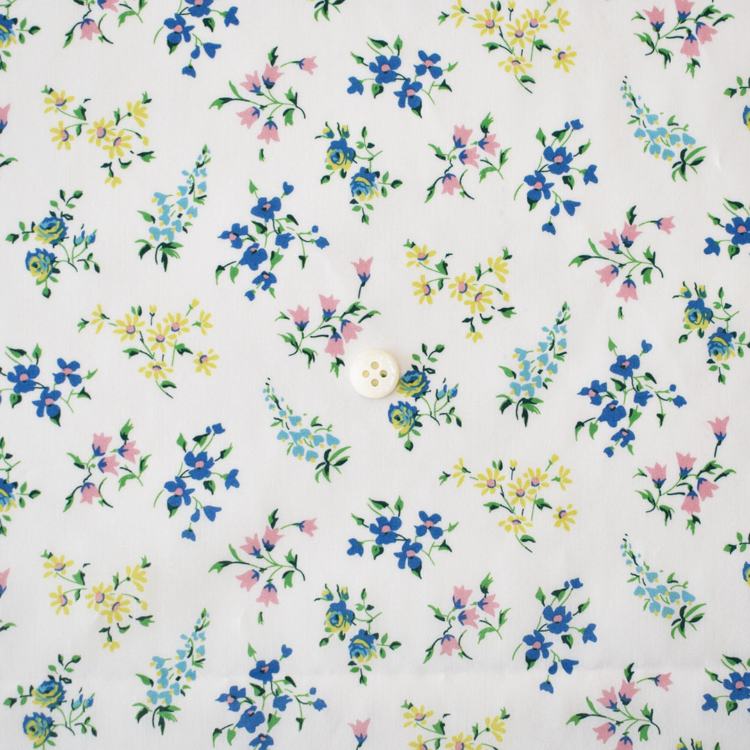 オリジナルは1995年にリバティのために手描きされたデザインで、風になびくように散りばめられた小花の小枝が表現されています。バラ、ヒナギク、ユリ、フジ、ブルーベルが舞う多方向性の花柄で、補色と対照的な色の組み合わせを実現するため、明るい背景だけでなく暗い背景の配色も用意されました。