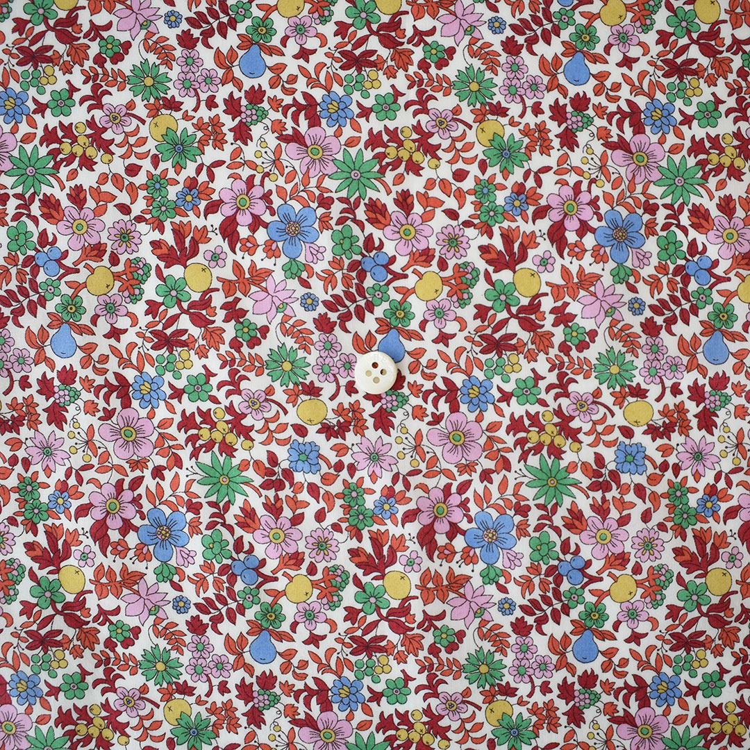 1964年にリバティのマートン工場で制作・印刷されたこの甘く愛らしいデザインには、ジューシーな夏のフルーツがたくさん描かれています。花、葉、ベリー、ブドウ、オレンジ、洋ナシなどのカラフルなボタニカルデザインは、1960年代の典型的なグラフィックプリントを彷彿とさせ、繊細でポップな美学が感じられます。