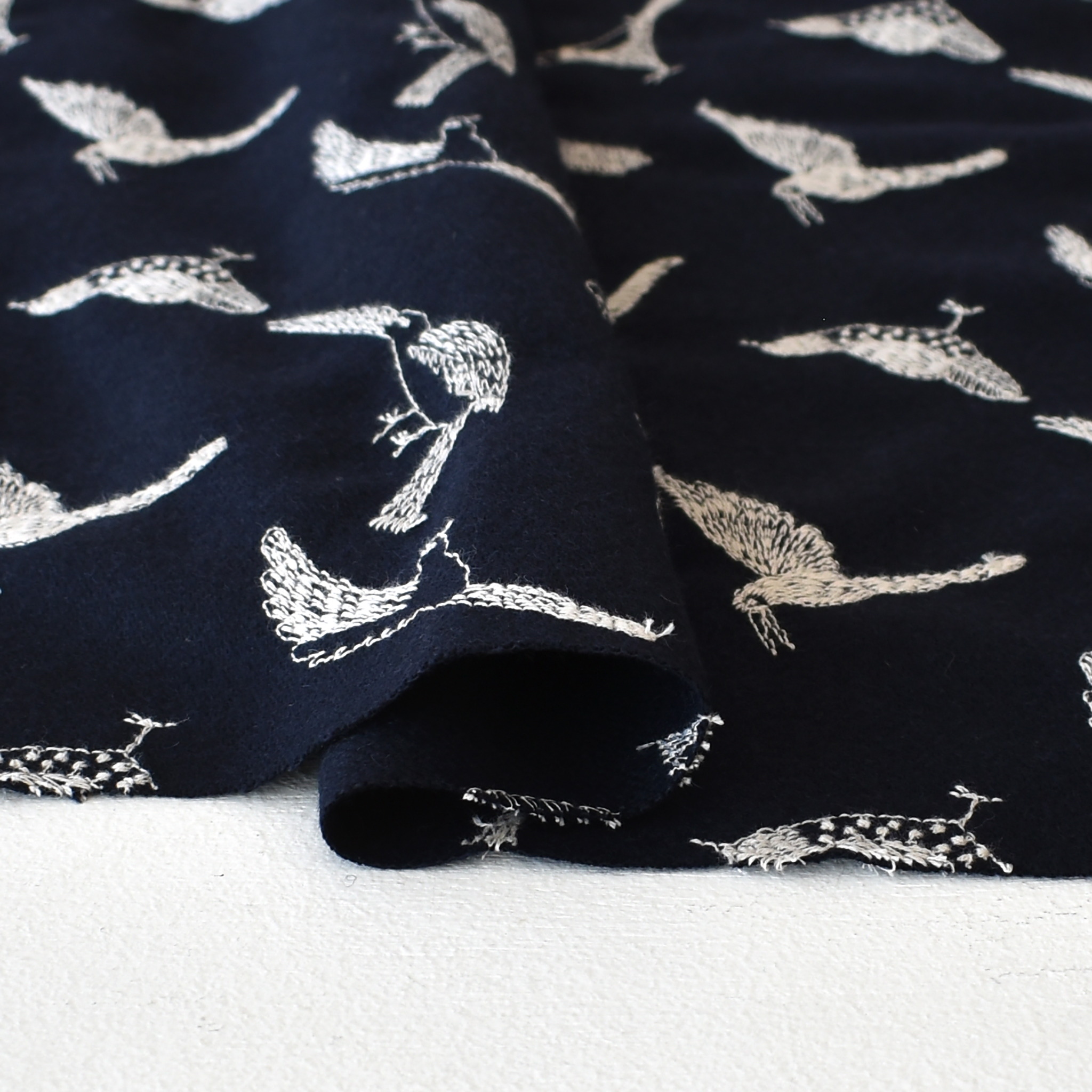 軽くてやわらかな風合いのウールに、中西なちおさんが描かれた愛らしい鳥の刺繍が施されています。