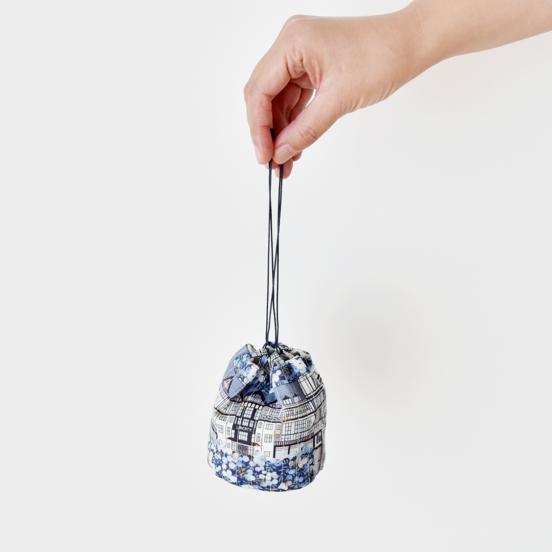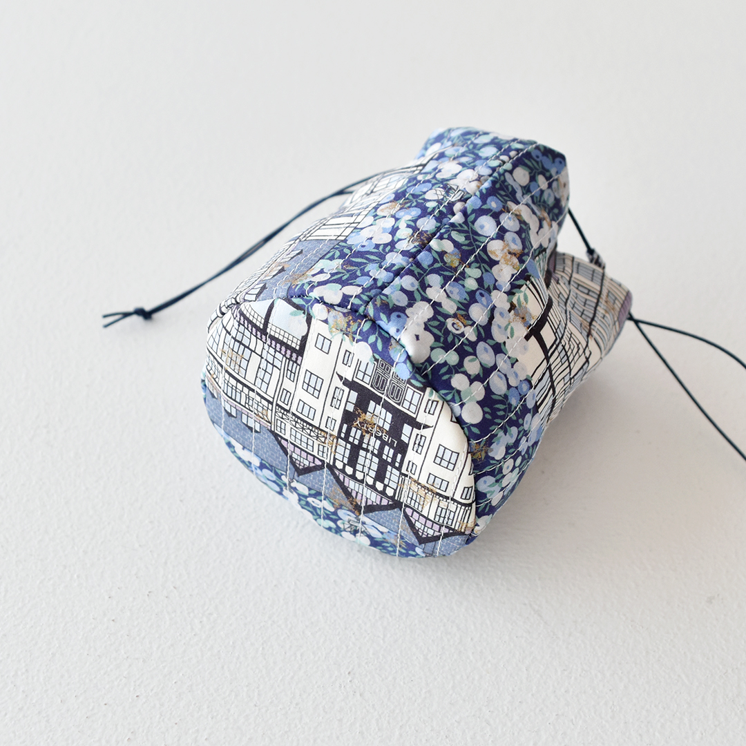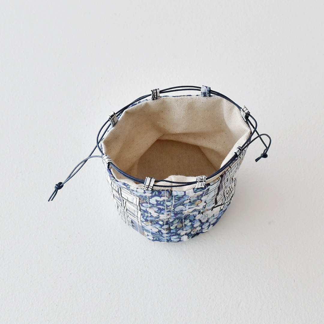 リバティプリントにミシンステッチワークを施して作る小さな丸底の巾着のキットです。