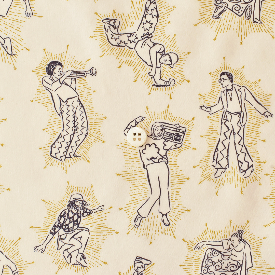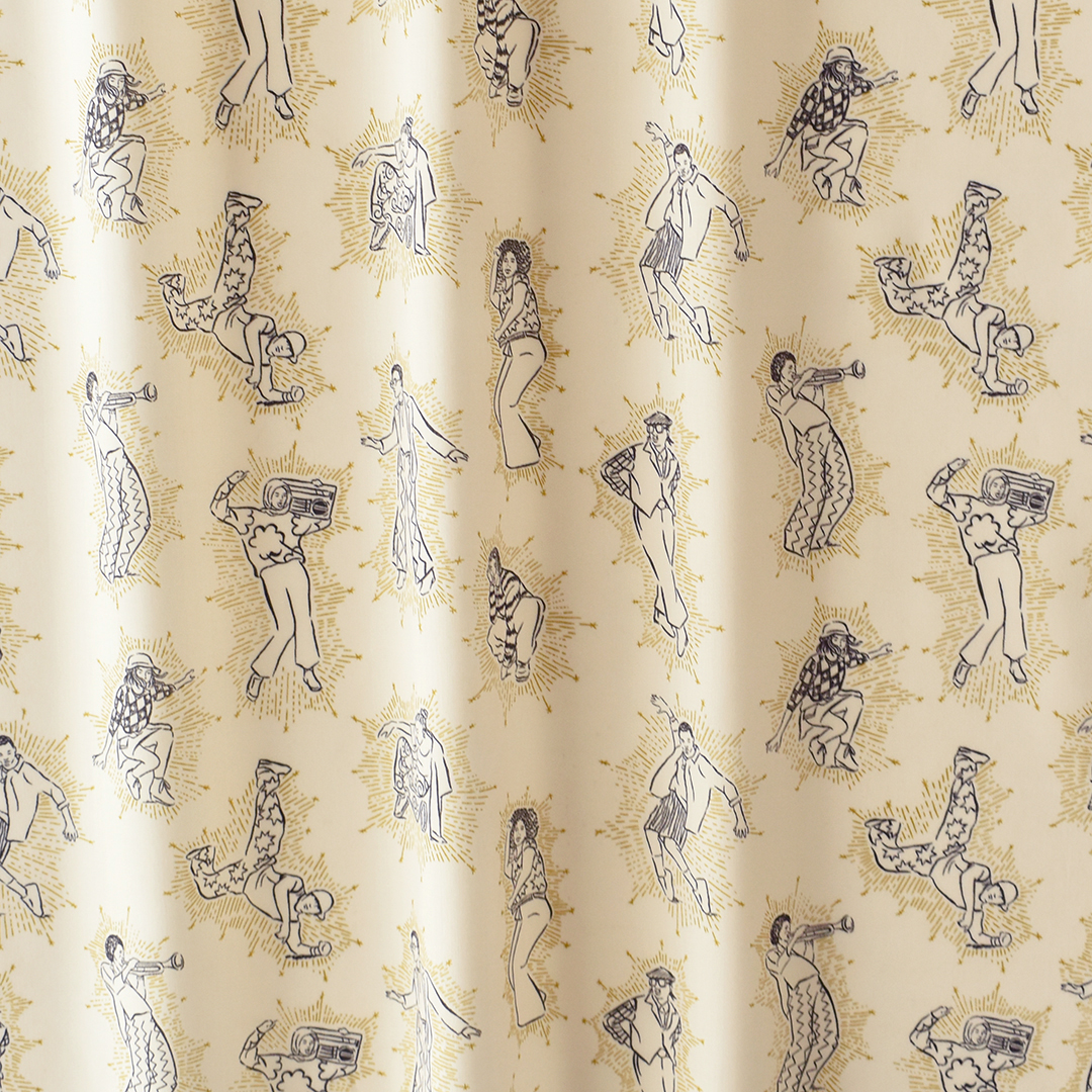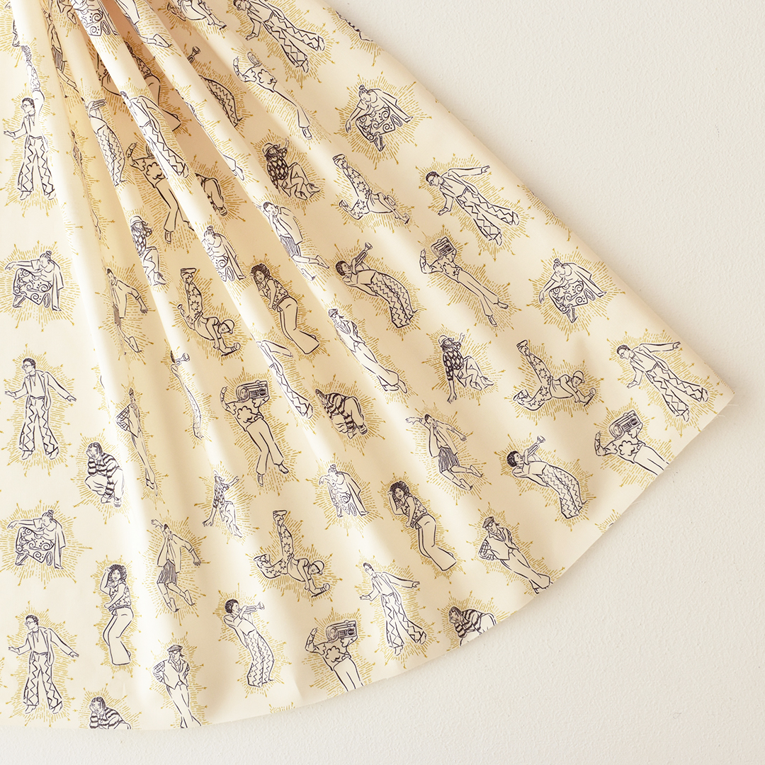 ファッションと音楽の深い結びつきからインスパイアされたダイナミックで表現力豊かなこのプリントは、ヒップホップとジャズの活気に満ちたサブカルチャーから影響を受けています。リバティデザインスタジオで手描きされたこのユニークでカンバセーショナルなプリントは、音楽のビートに合わせて流れるように動く想像上のダンサーたちを表現しています。