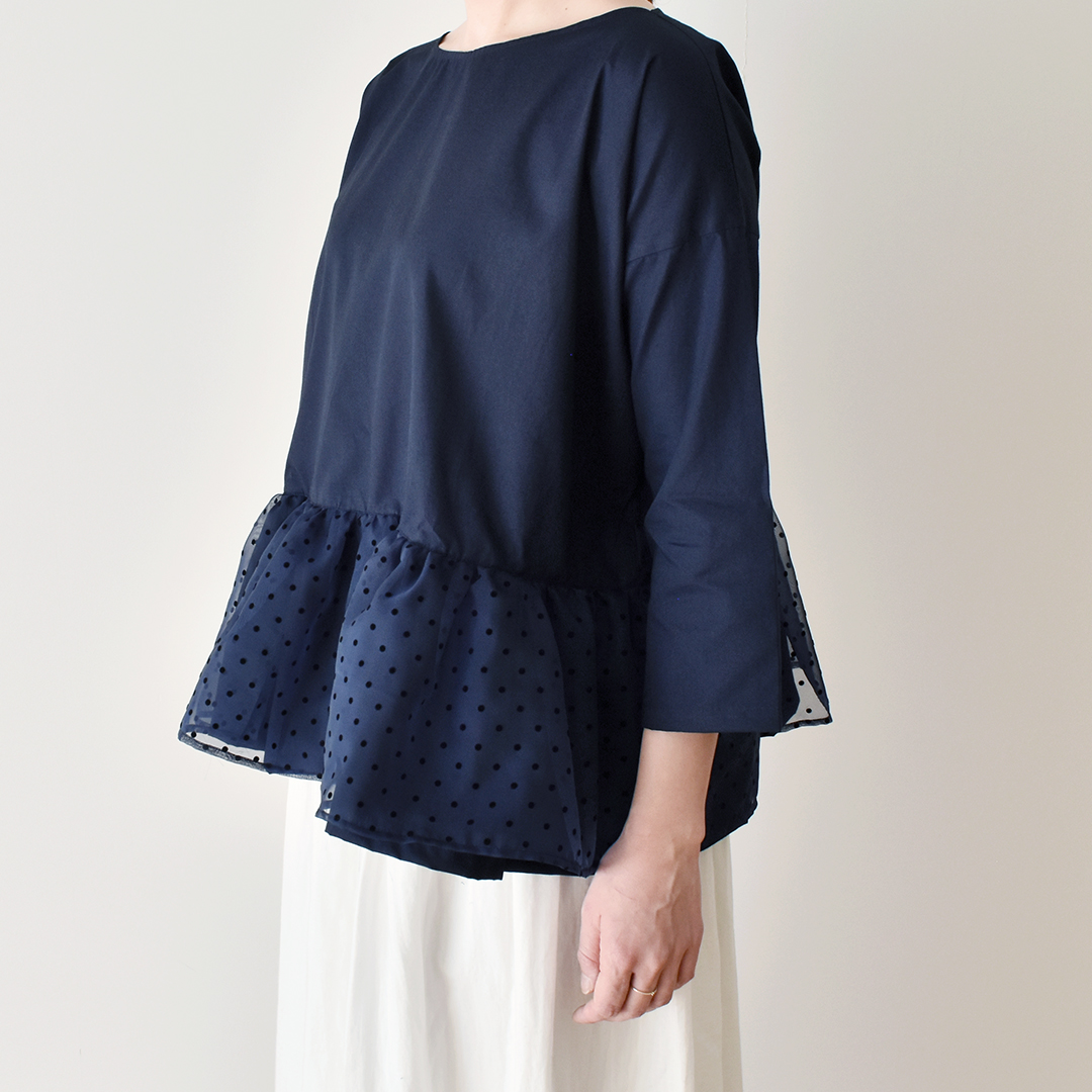 こちらの布をお買い上げのお客さまに、デイリープルオーバー(ギャザーブラウス・オーガンジーアレンジ)のレシピをおつけいたします。初めてご紹介するレシピです。(サンプル:ネイビー地にブラック)※用尺 110cm幅×0.5m