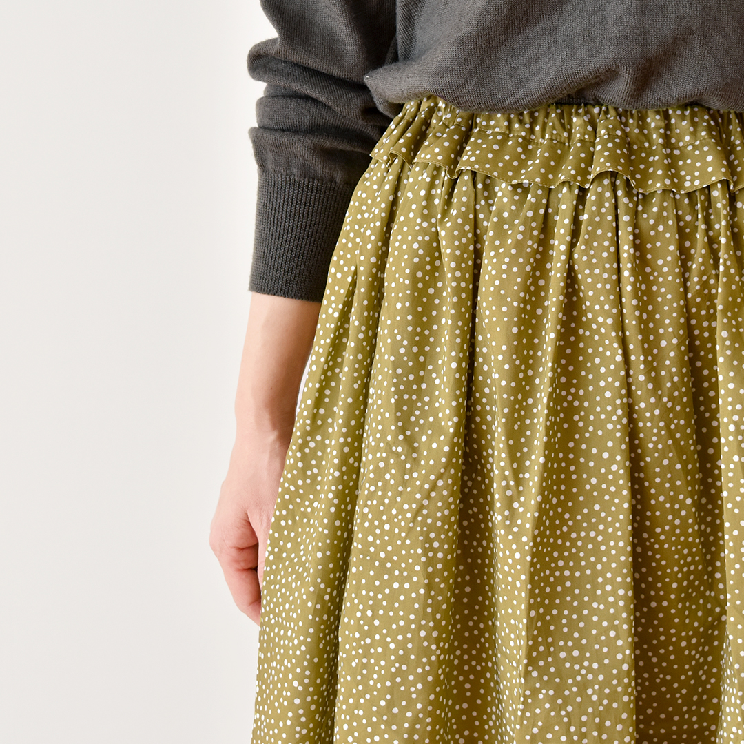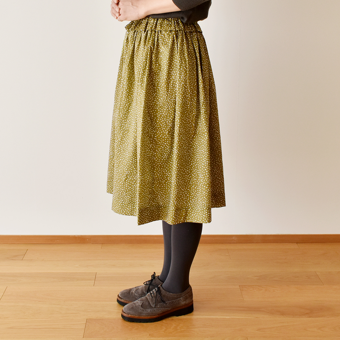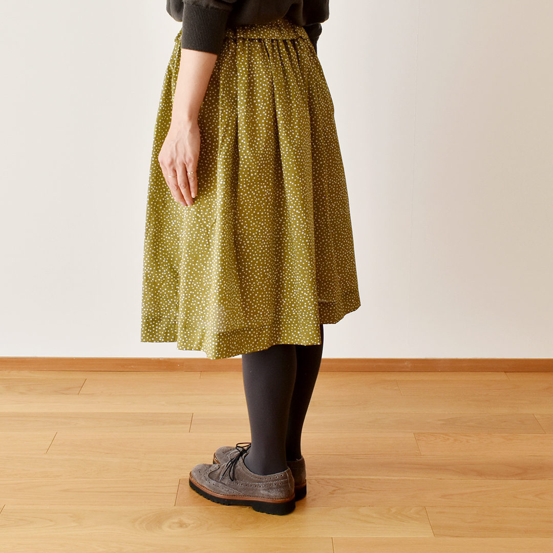 こちらの布をお買い上げのお客さまに、ギャザースカートのレシピをおつけいたします。(サンプル:◎J26C(オリーブにホワイト)) ※用尺:108cm幅×1.6m