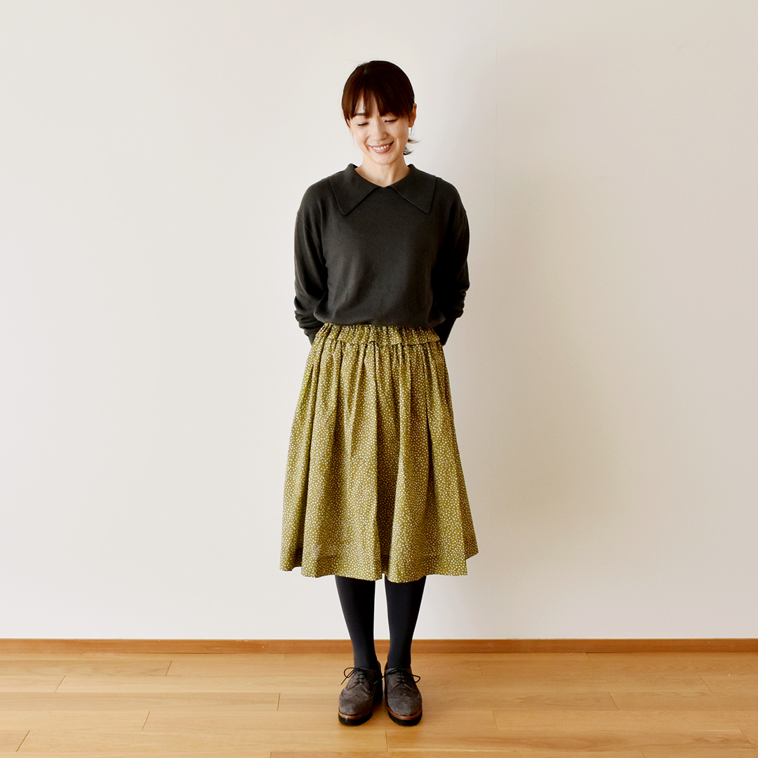 こちらの布をお買い上げのお客さまに、ギャザースカートのレシピをおつけいたします。(サンプル:◎J26C(オリーブにホワイト)) ※用尺:108cm幅×1.6m