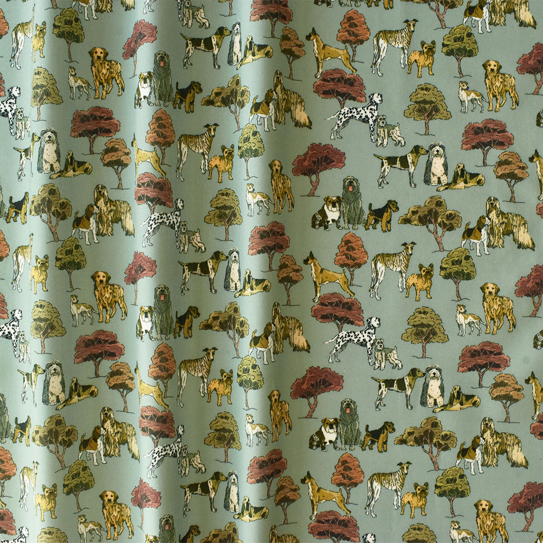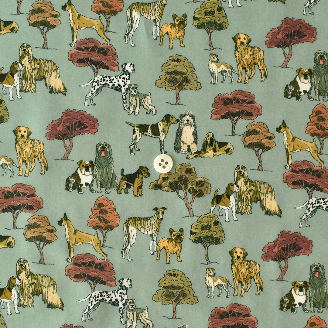 ロンドンのハイドパークの緑豊かな木々の中で、雄大な犬が朝の散歩を楽しんでいます。ブルドッグ、ウェルシュ・テリア、ラブラドール、ダルメシアン、ボクサー、オールドイングリッシュ・シープドッグ、アフガン・ハウンド、ビーグル、シュナウザー、ゴールデンレトリバー、ポインター、グレーハウンドなど、さまざまな種類の犬が描かれています。リバティのデザインスタジオでペンとインクで描かれたモチーフは、デジタルで着色され、大胆な下地が加えられています。