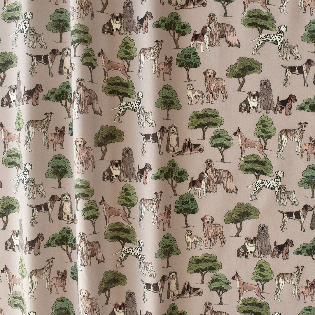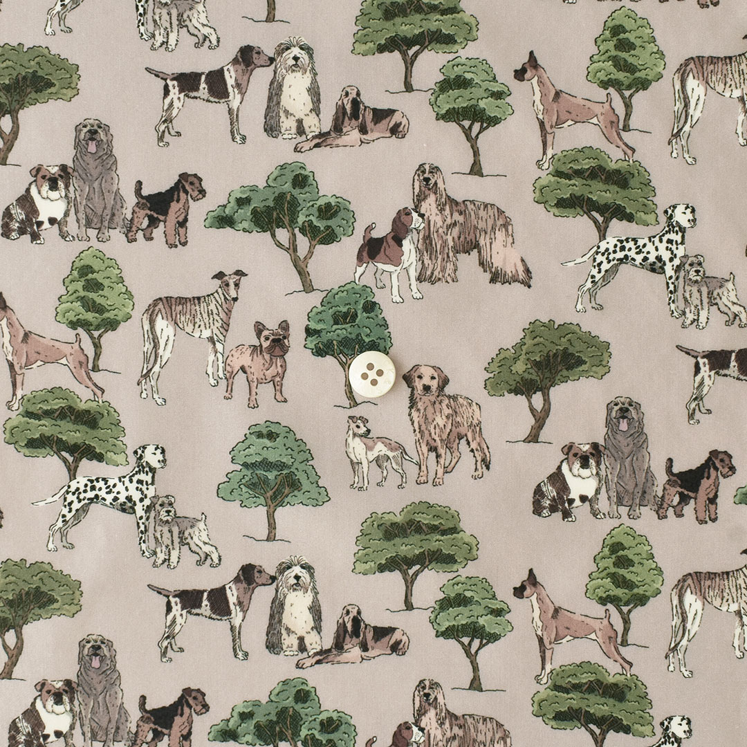 ロンドンのハイドパークの緑豊かな木々の中で、雄大な犬が朝の散歩を楽しんでいます。ブルドッグ、ウェルシュ・テリア、ラブラドール、ダルメシアン、ボクサー、オールドイングリッシュ・シープドッグ、アフガン・ハウンド、ビーグル、シュナウザー、ゴールデンレトリバー、ポインター、グレーハウンドなど、さまざまな種類の犬が描かれています。リバティのデザインスタジオでペンとインクで描かれたモチーフは、デジタルで着色され、大胆な下地が加えられています。