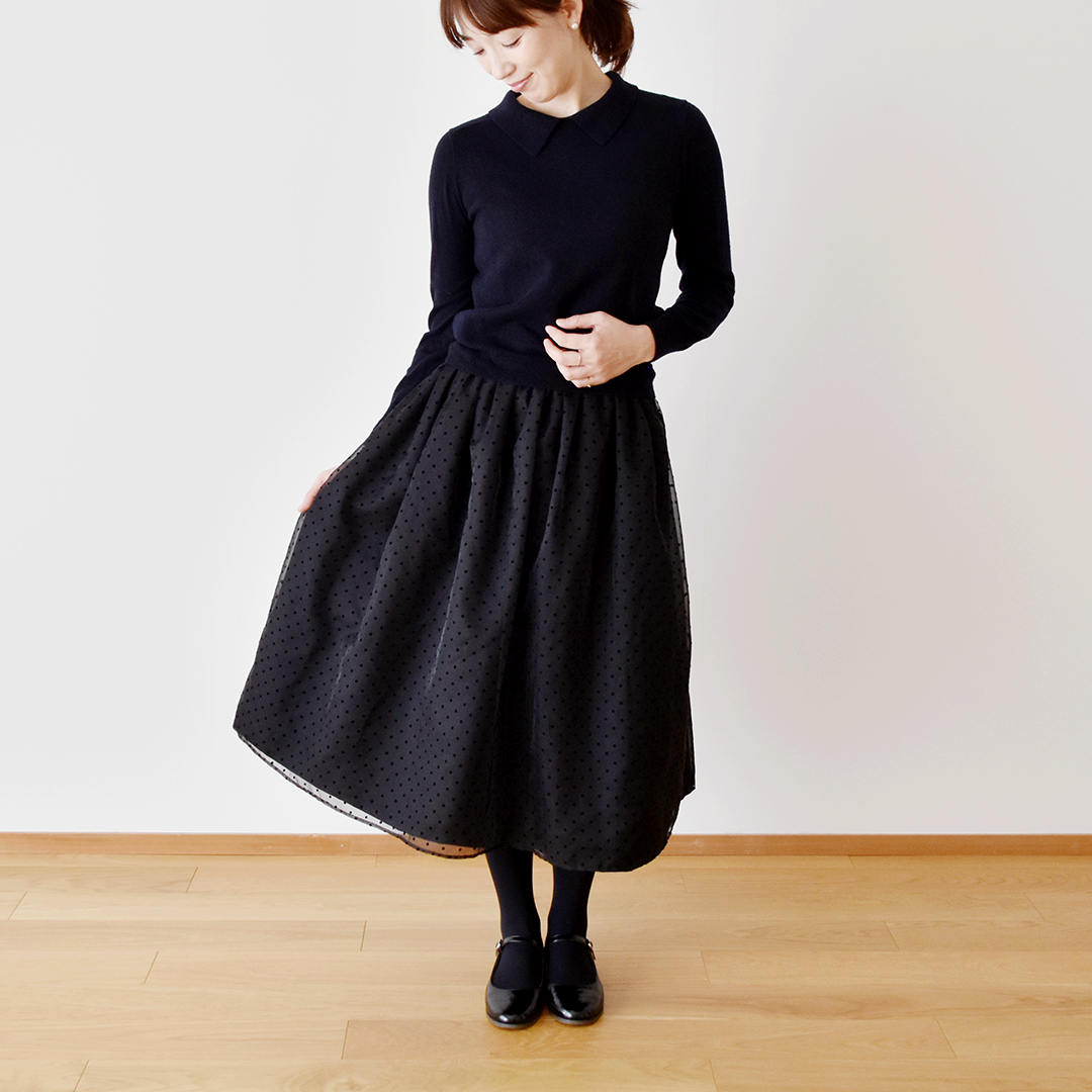 こちらの布をお買い上げのお客さまに、大人用・子ども用(大)・(小)のオーガンジースカートのレシピをお付けします。作り方は大人用も子ども用もほとんど同じです。(サンプル:ブラック地にブラック) ※用尺:110cm幅×大人用 1.6m/子ども用(大) 1m/子ども用(小) 0.7m