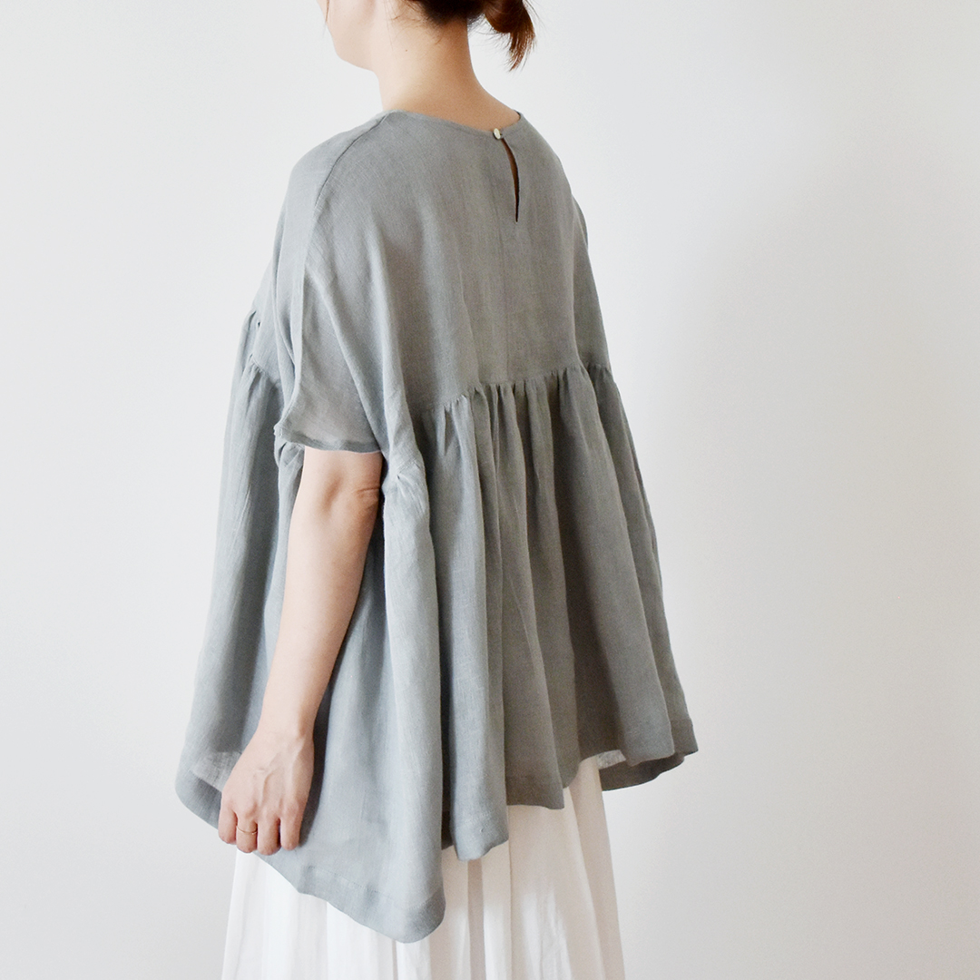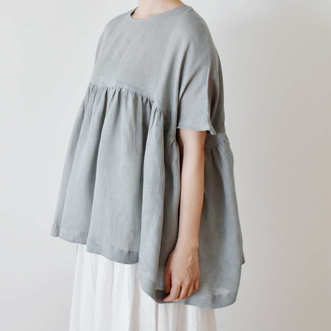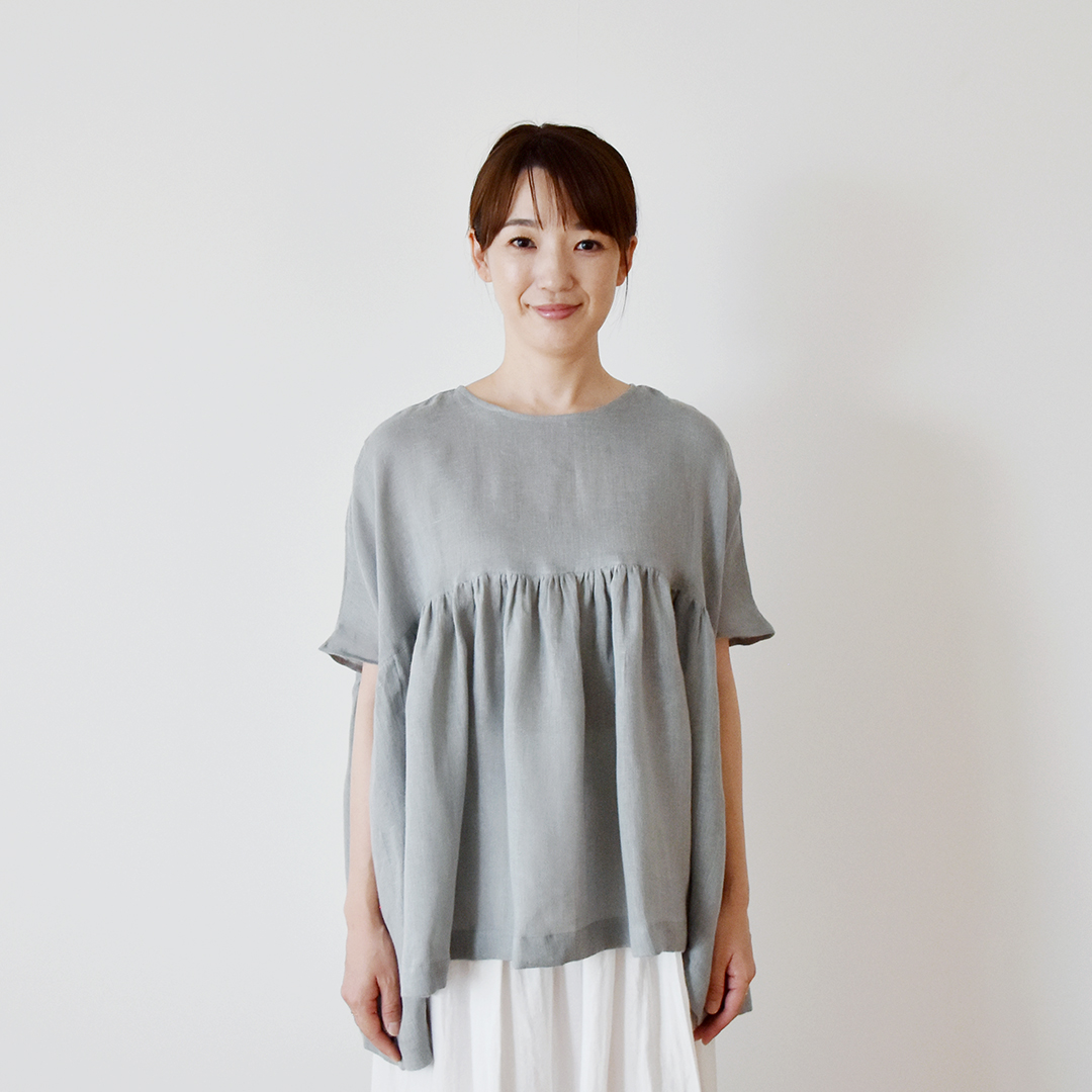 スモークブルーグレー:『CHECK&STRIPE COLOUR BOOK 色を楽しむソーイングブック』(文化出版局) ハイウエストのギャザーブラウス