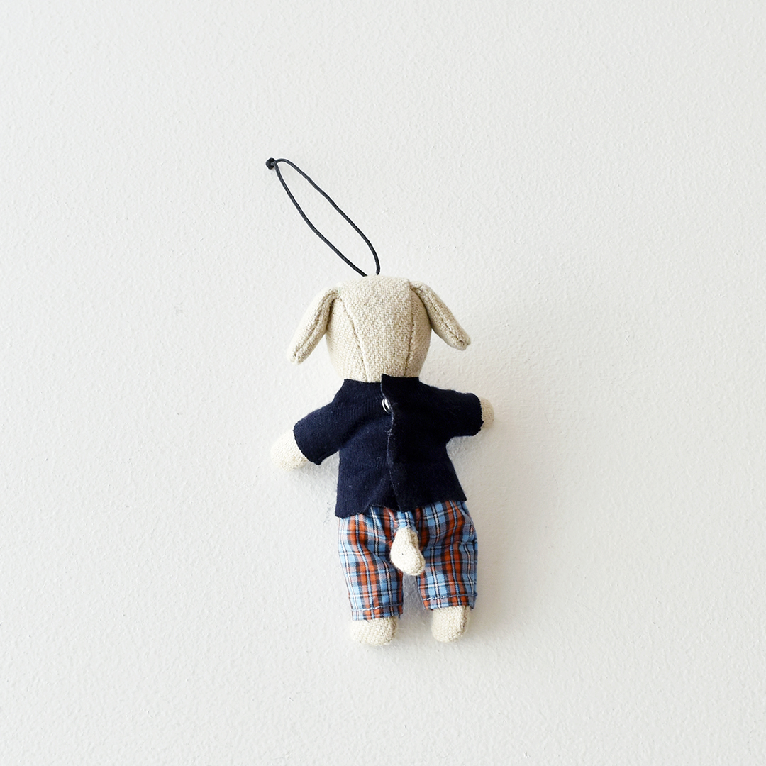 本体は幅広ハーフリネンツイル、パンツには今回のために特別に選んだタータンチェックのコットン生地を使用しています。服は脱ぎ着ができますので、お着替えも楽しめます。