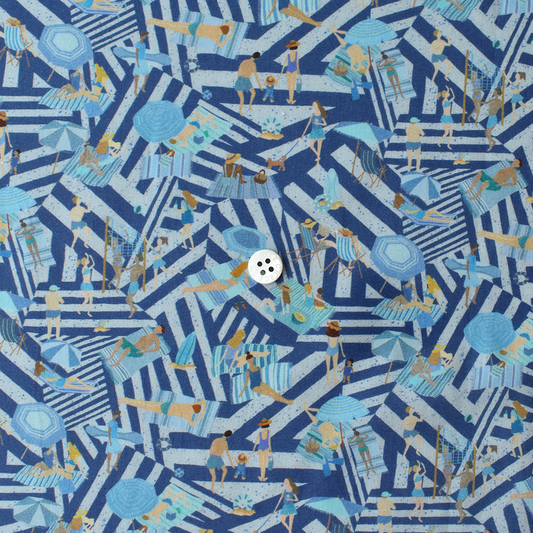 リバティのスタジオで手描きされた、遊び心あふれるカンバセーショナル・パターン「ショアライン」。細部まで描き込まれた数々のモチーフが、見る人を物語の中へと誘います。グレイソン・ペリーのセラミック作品に見られる社会的な物語性や、ミクストメディアを自在に取り入れる表現手法から着想を得て、英国の海辺で過ごす夏の、のびやかで気ままな空気感を描き出しています。浜辺では、砂浜でくつろいだり、遊びに興じたり、本を読む人々の姿が点在し、背景に配された大胆なストライプが、現代的なエッジを加えています。幾何学的なコラージュ効果が、全体にさりげない奥行きをもたらしています。