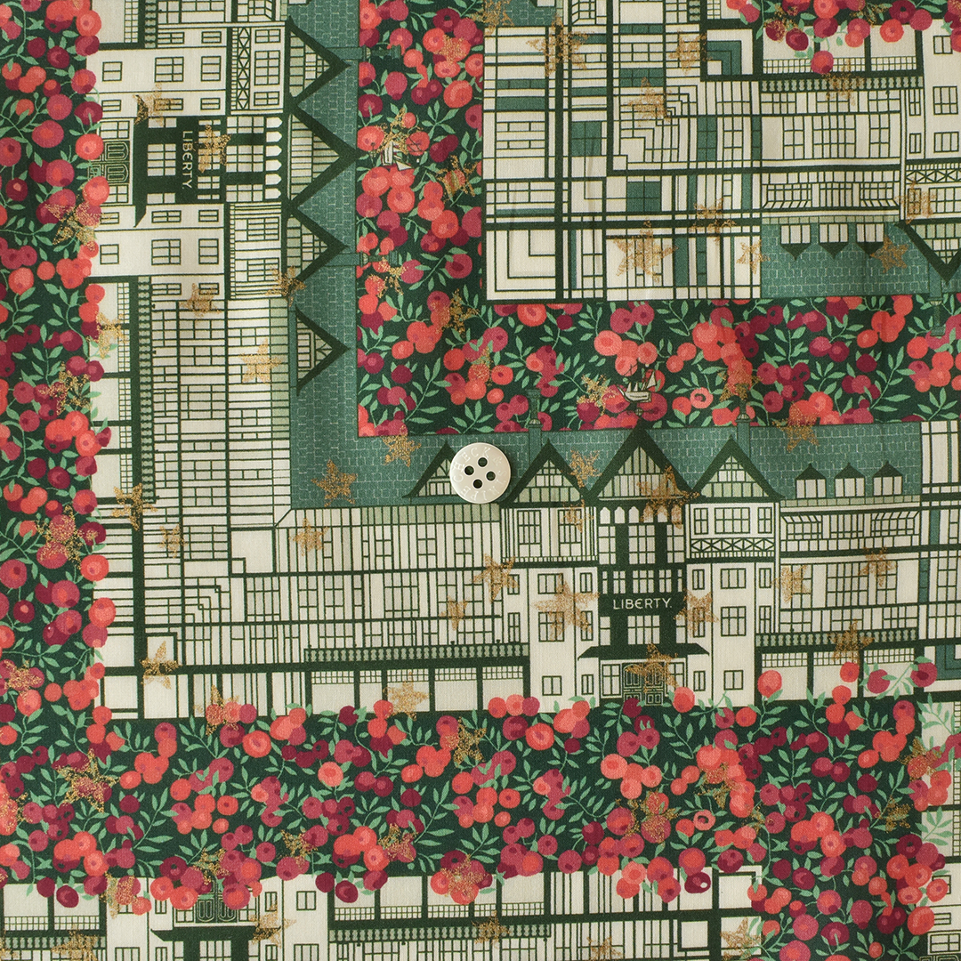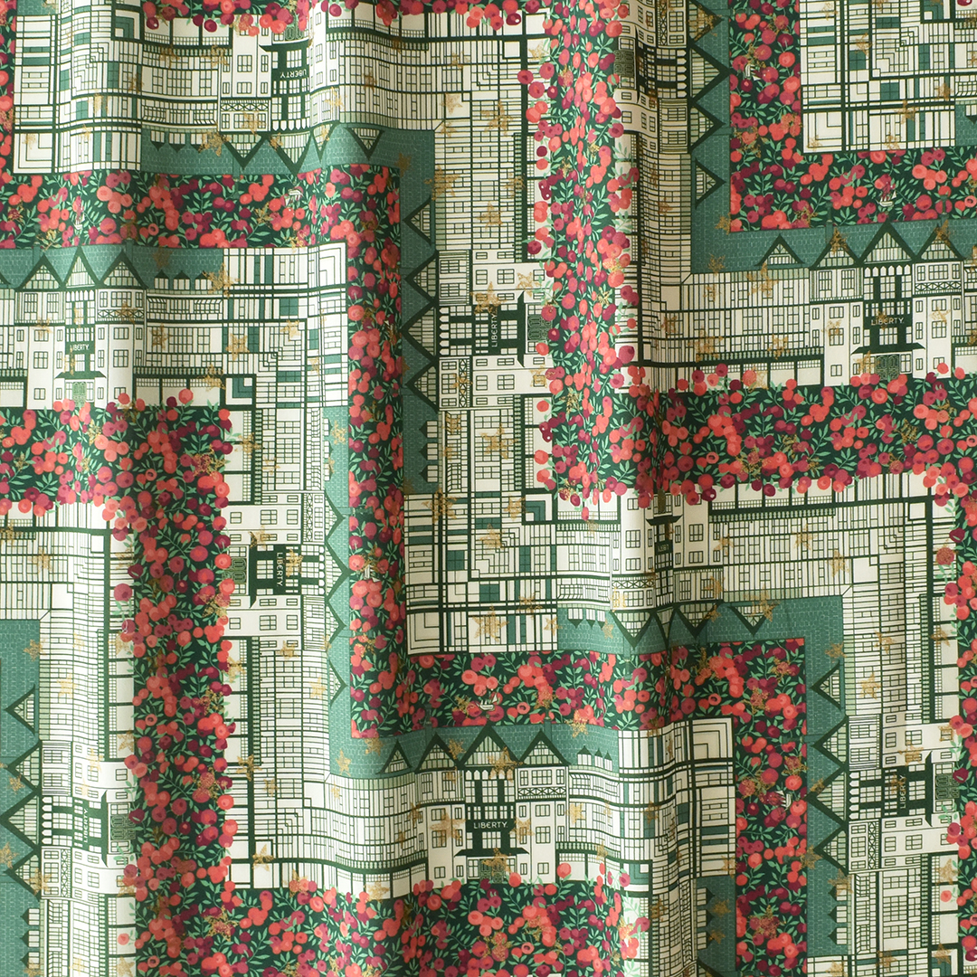 リバティ本店とその象徴するすべてへのラブレターのようなデザインでの「チューダー・ベリー」。「チューダー・ベル」と「ウィルトシャー・ベリー」を独自に組み合わせ、ひねりを加えたひと柄。きらめく星々を映し出すように仕上げられており、ホリデーシーズンにリージェント・ストリートの木製の扉をくぐるときのわくわくした気持ちを呼び起こします。