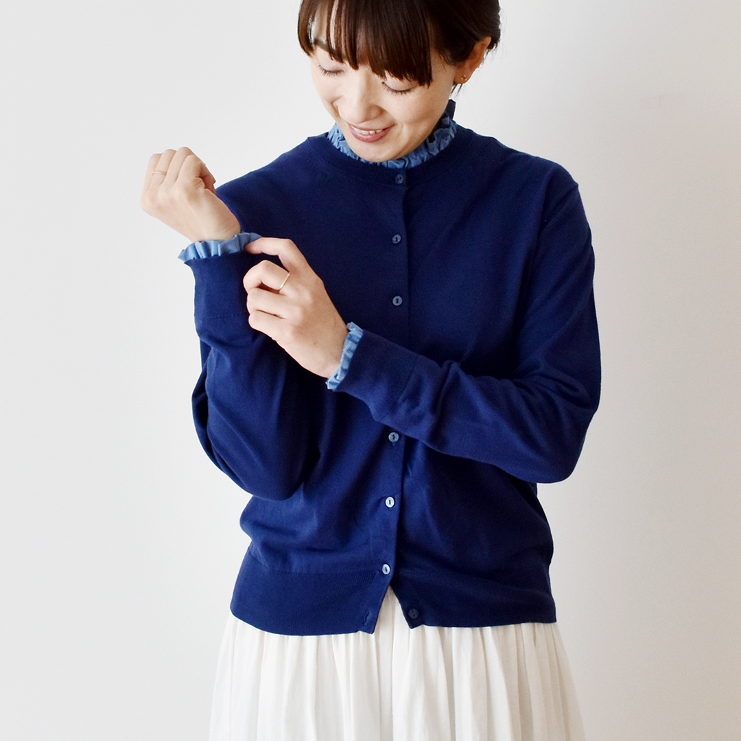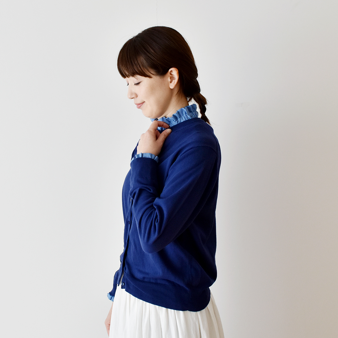 衿ぐりや袖口につけて、重ね着風に見せることができます。衿ぐりや袖口から少しフリルが見えてコーディネートのポイントになります。