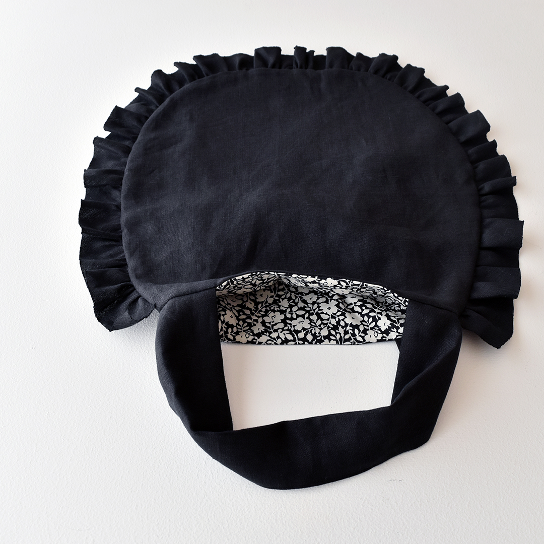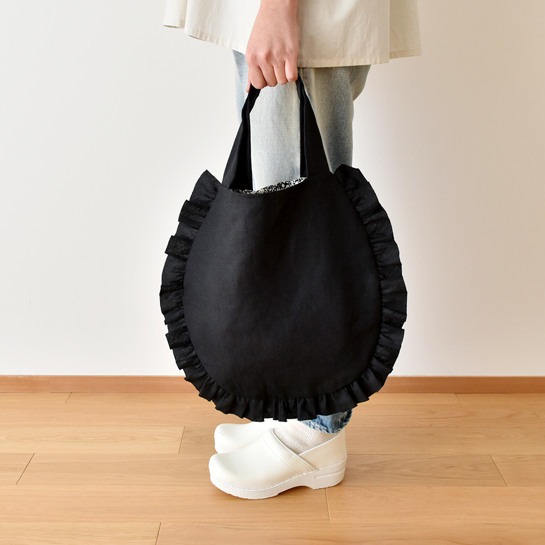 出来上がりサイズ:タテ約35cm×ヨコ約33.5cm、袋口部分約25cm(フリル含まず)、持ち手約38cm